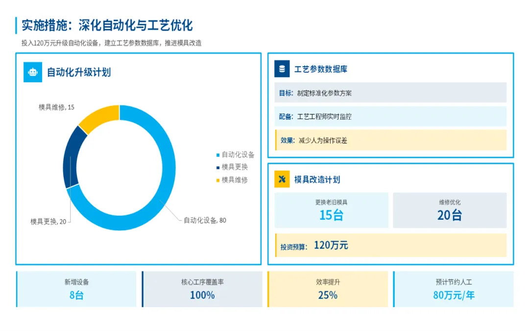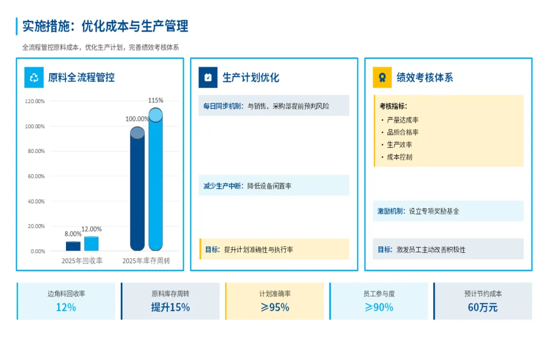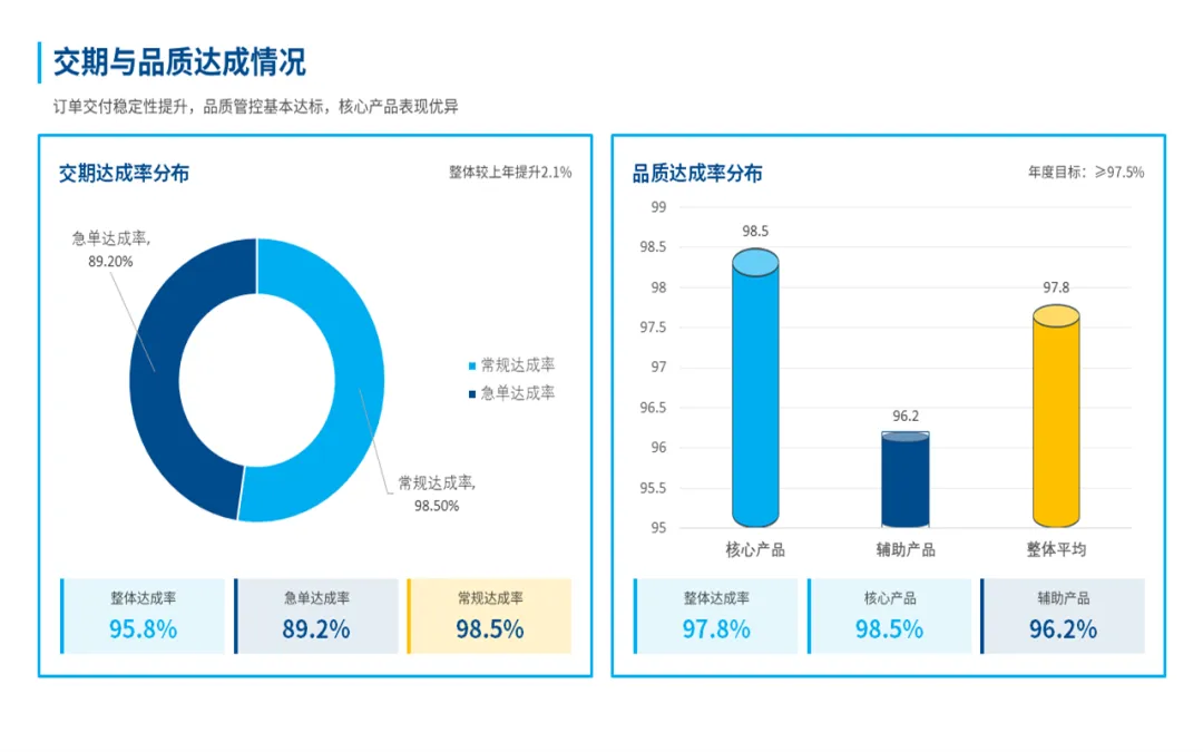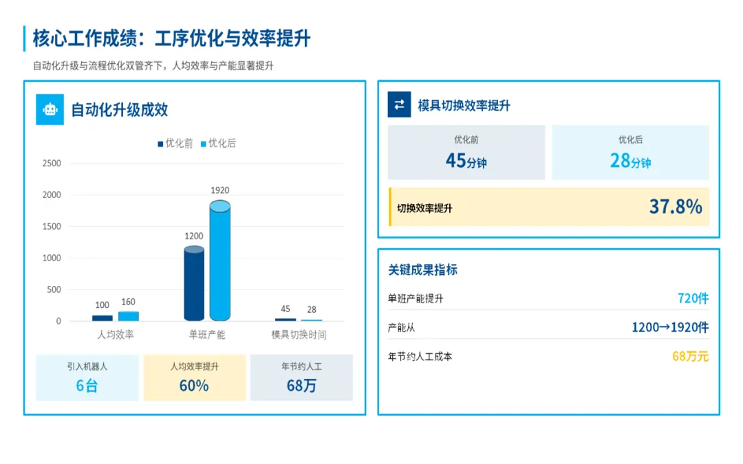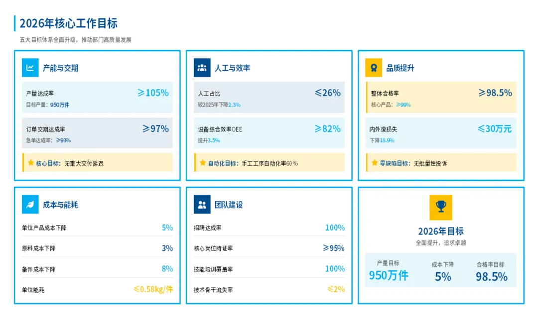 总体来看,在过去的一年,我们部门始终围着公司核心目标转,在提升产能、控制成本和团队建设上,还是下了很多功夫的,也见到了一些实实在在的效果。比如说产量、交货期、产品合格率这些关键指标,我们都达成了,不少还超出了原定的计划目标。这些成绩的取得,是产线自动化升级和工艺的持续优化所带来的,既帮我们提升了效率,也为公司省了不少钱。