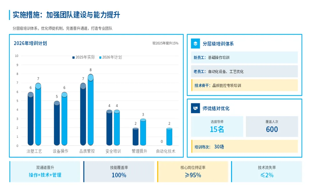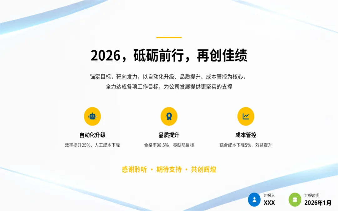 我们看清了问题,也是为了更好地出发,所以呢,在这份注塑部门年终工作总结汇报ppt中的最后部分,对2026年的目标进行了量化,明年我们的工作重心将在深化自动化、抓牢全流程品质、生产管理优化这几个关键环节上。当然,这些还需要兄弟部门的支持和公司领导的协调,我们相信,通过内部持续改善和外部高效协同,注塑部一定能为公司在新一年的高质量发展中,提供更坚实、更可靠的支撑。