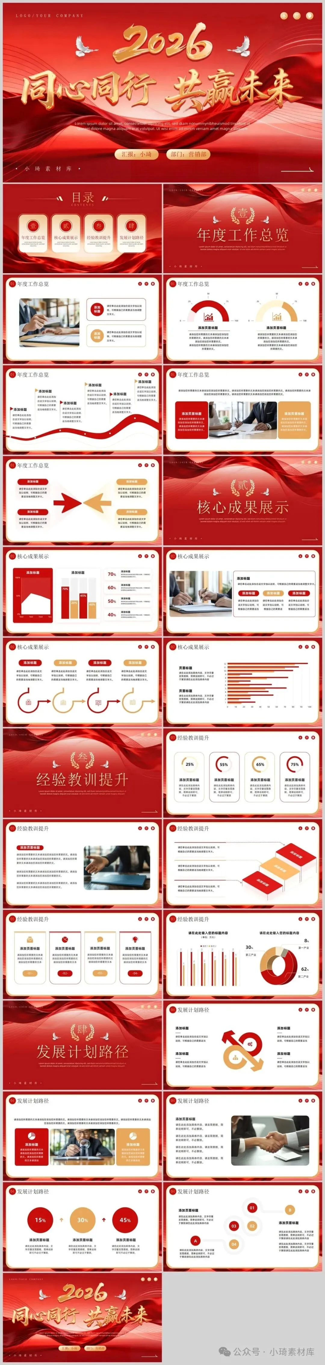 红金色商务大气风年度工作总结PPT模板,以稳重红金为主色调,融合现代简约与经典商务元素,专为高端场合打造。