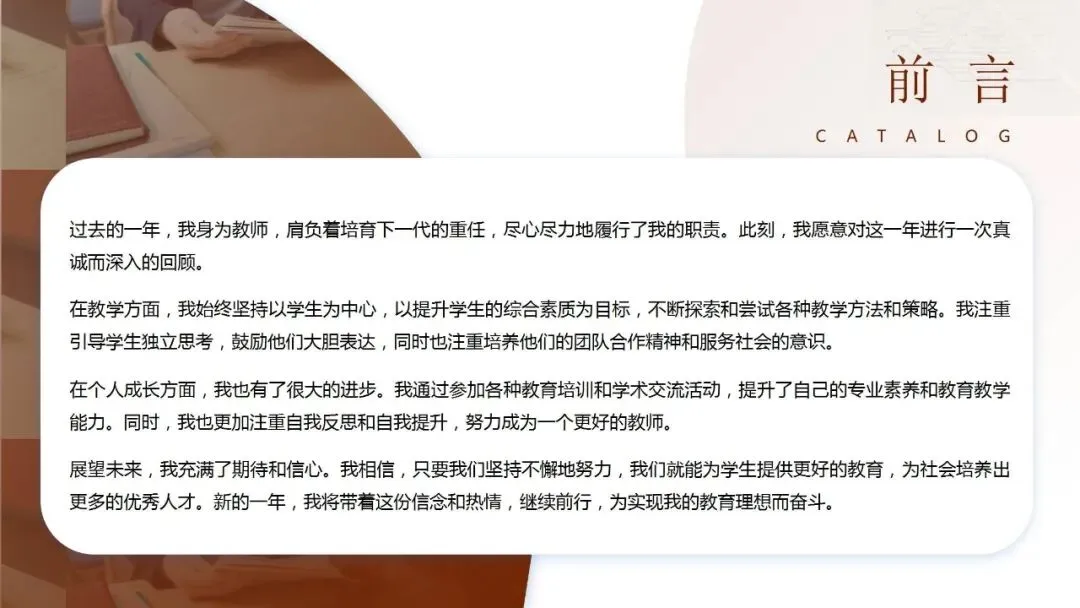 这是一套褐色会议场景背景的“从心出发启迪未来”教师年终总结汇报PPT模板,共23页