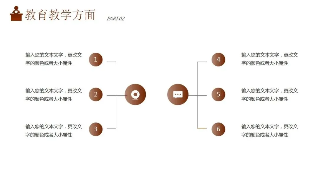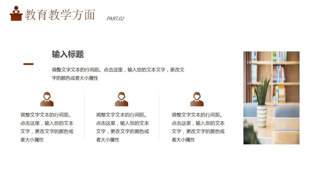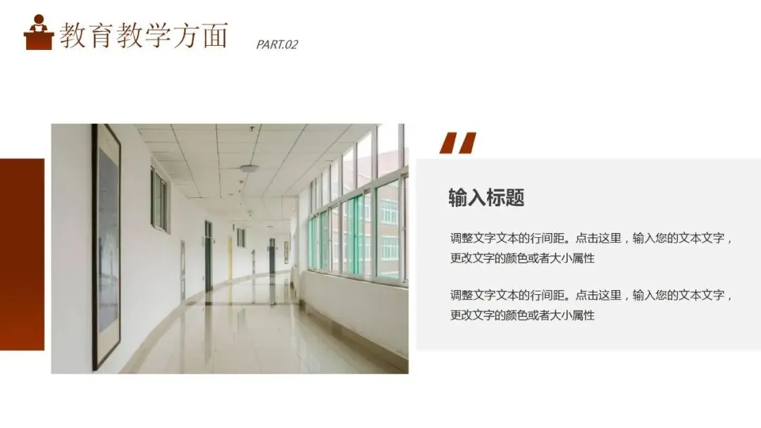 PowerPoint模板内容页,由21张褐色动态幻灯片图表,搭配PPT文字排版组成。另外使用了学校走廊插图、书架插图、学生插图等装饰。