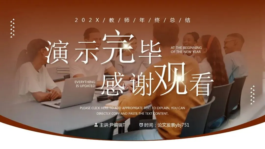 【褐色会议场景背景的“从心出发启迪未来”教师年终总结汇报PPT模板】