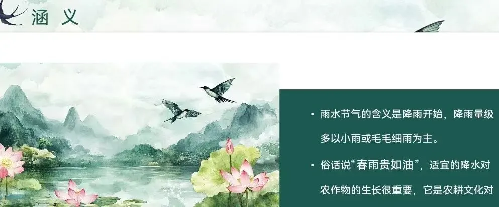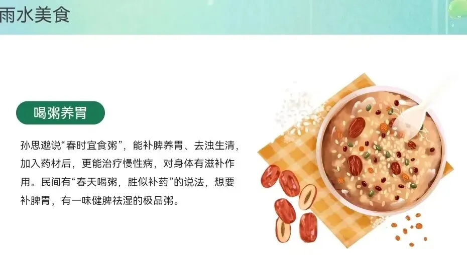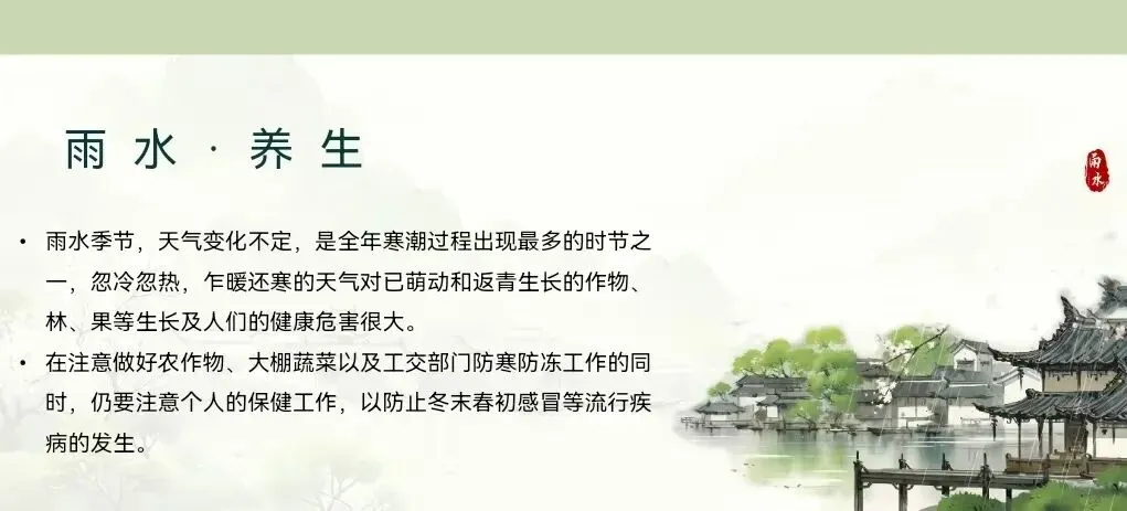 雨水节气后,湿气渐盛,古人强调“春捂”保暖,避免湿气侵入身体。饮食上偏爱山药、莲子等健脾祛湿的食材,体现了顺应自然、调养身心的养生理念,反映了古人对季节变化与人体健康的深刻认知。