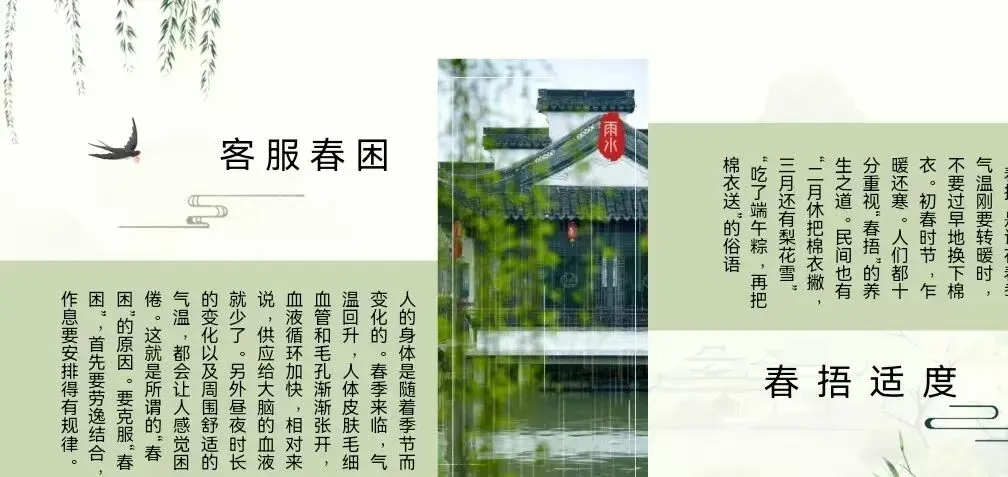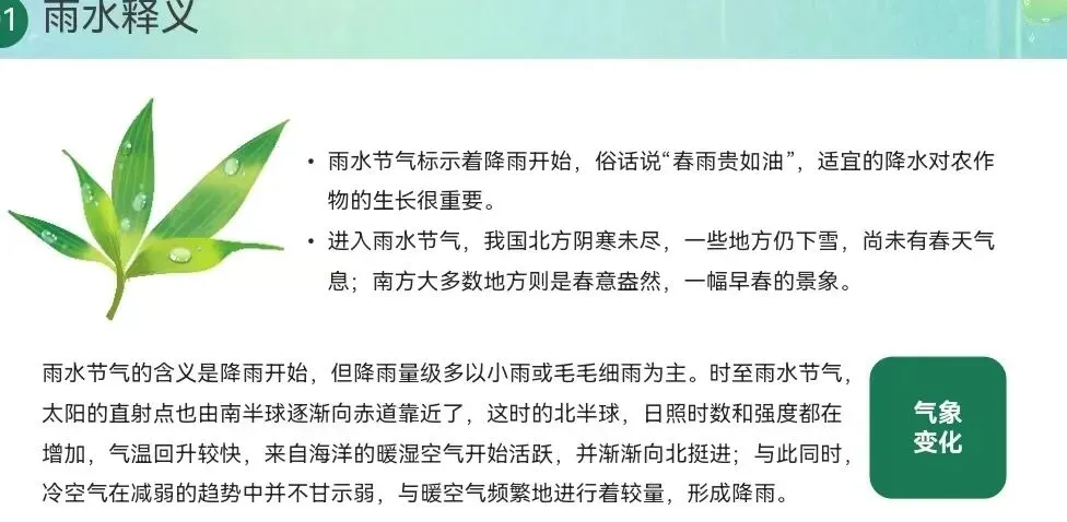 三候草木萌动:草木随地中阳气的上腾而开始抽出嫩芽,大地逐渐呈现出欣欣向荣的景象。温馨提示:雨水节气乍暖还寒,气温起伏较大,建议根据天气变化及时调整衣物,注意保暖,预防感冒。