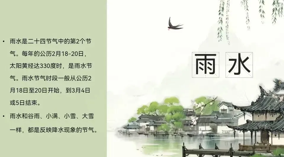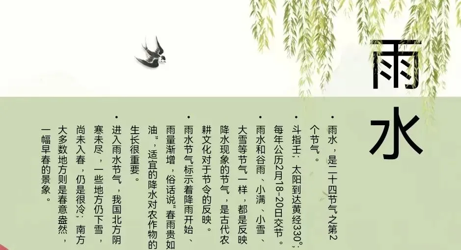 雨水,二十四节气中的第二个节气。斗指壬;太阳到达黄经330°;每年公历2月18-20日交节。雨水节气的含义是降雨开始,降雨量级多以小雨或毛毛细雨为主,适宜的降水对农作物的生长很重要,是农耕文化对于节令的反映。