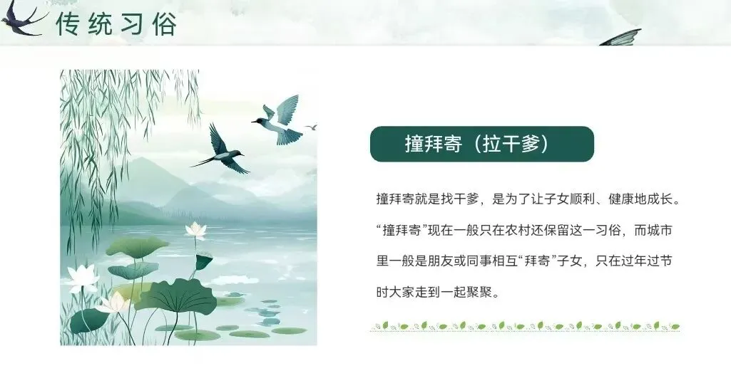 在四川、川西等地,父母为了祈求子女健康成长,会在雨水节这天带着孩子在路边等待第一个经过的行人,让孩子磕头拜寄,认其为干爹或干妈,寓意借助他人的福气护佑孩子平安成长。