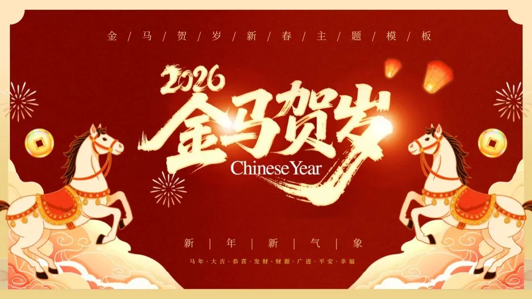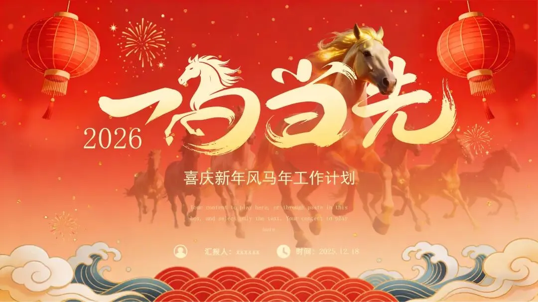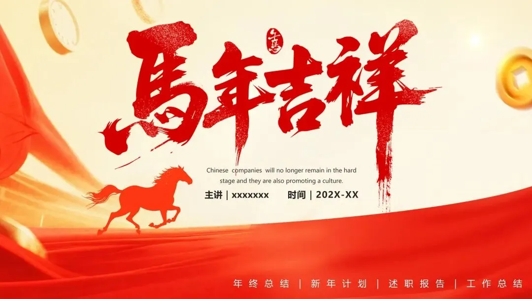 简化纹样:将复杂的传统纹样(云纹、回纹、冰裂纹)简化为几何线条符号重构:将“福”字、铜钱、灯笼等符号转化为简约的线性图标材质感:在关键位置添加微妙的纸张纹理或丝绸质感原创图形元素5套马年贺岁PPT模板,免费下载方法如下: