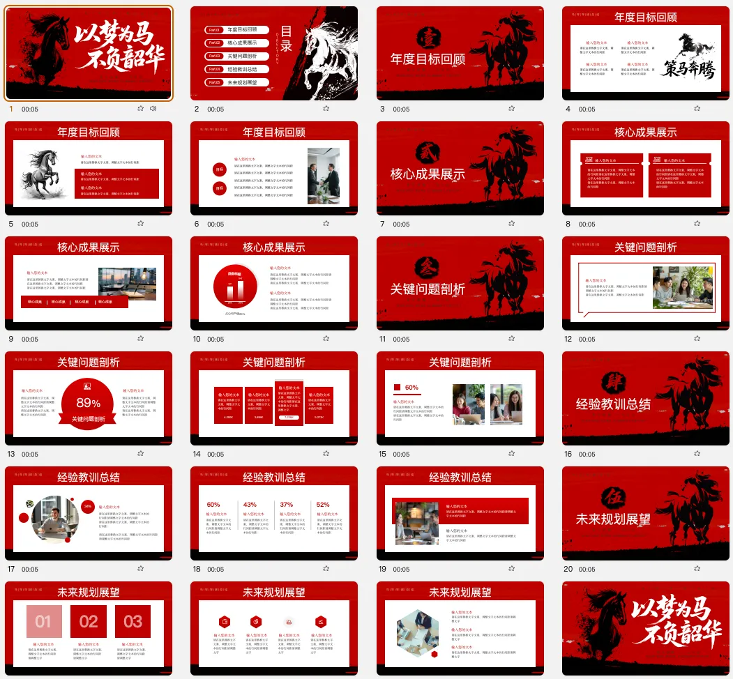 我们为你打包好了 16套2026甲午马年主题PPT模板,风格大气统一,红金配色充满新年祥瑞气息,助你快速做出惊艳全场的演示文稿。
