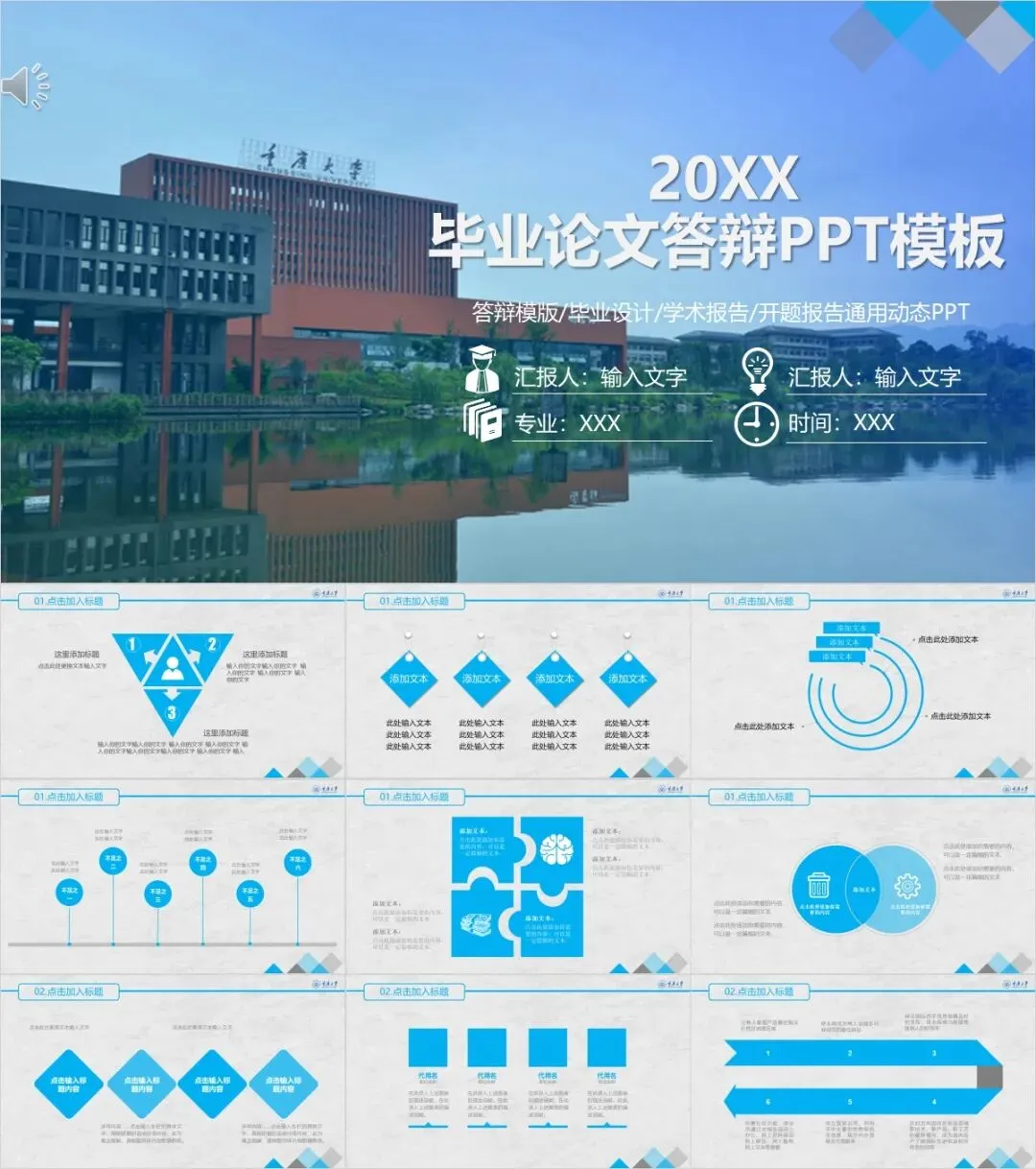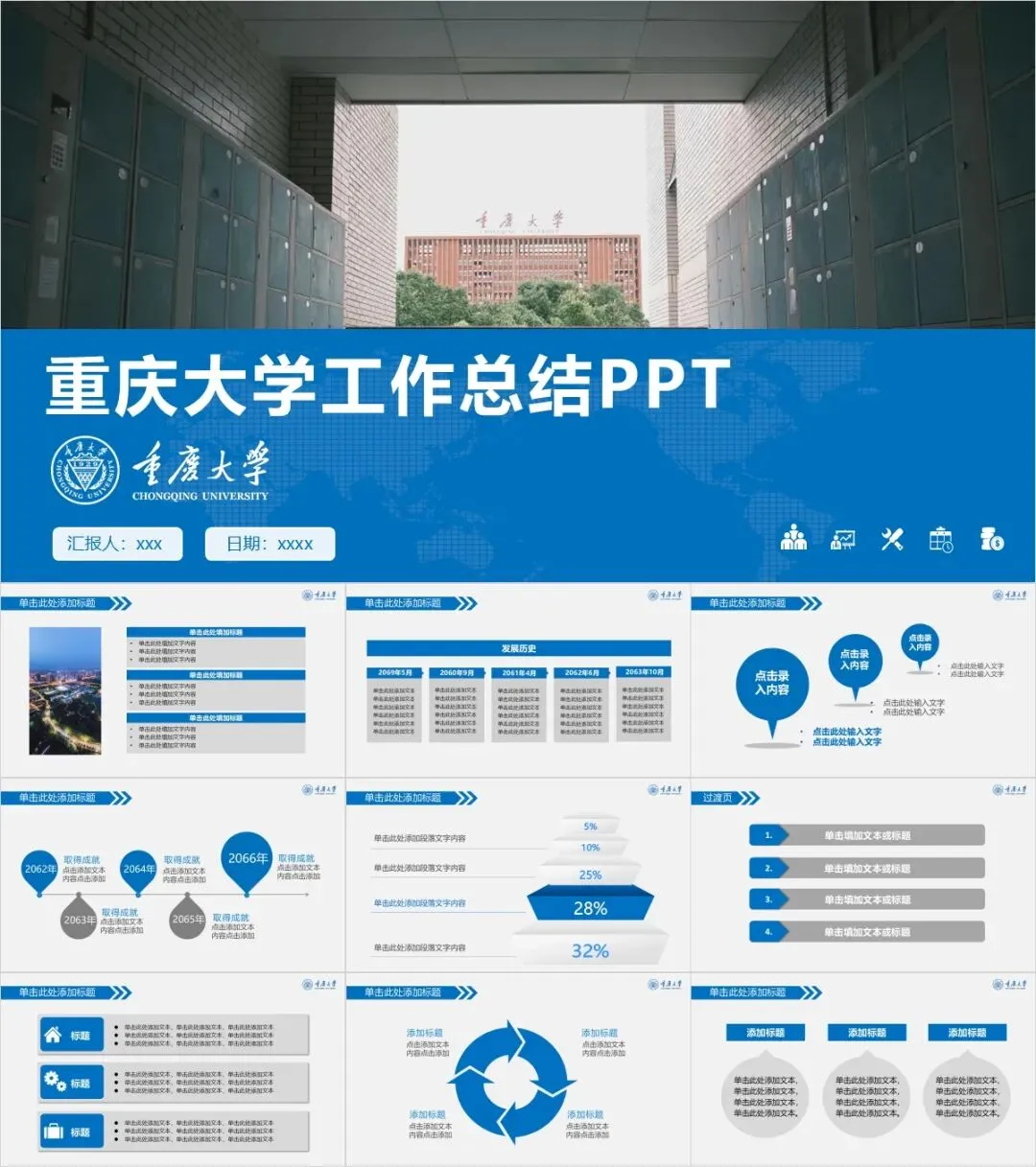 以上是我们为大家准备的重庆大学专属PPT模板,文中的所有板式都是可编辑的,大家可以上传替换自己喜欢的校园美景,做出具有自己风格的专属PPT哦!其他同学也可以给我留言