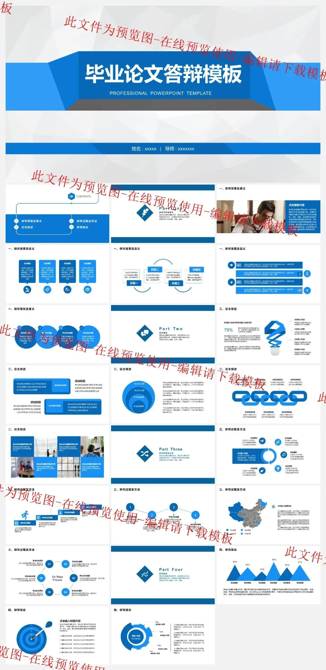 本次整理了论文答辩的综合包,里面有论文答辩PPT模板,全学科通用,可编辑。还包含开题答辩和毕业答辩。还有做答辩PPT的方法、论文答辩的技巧和答辩流程。