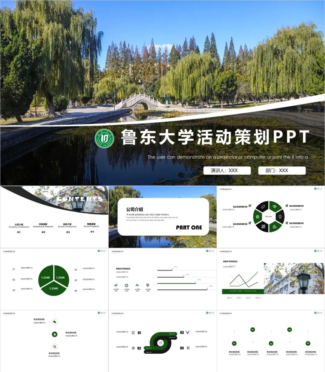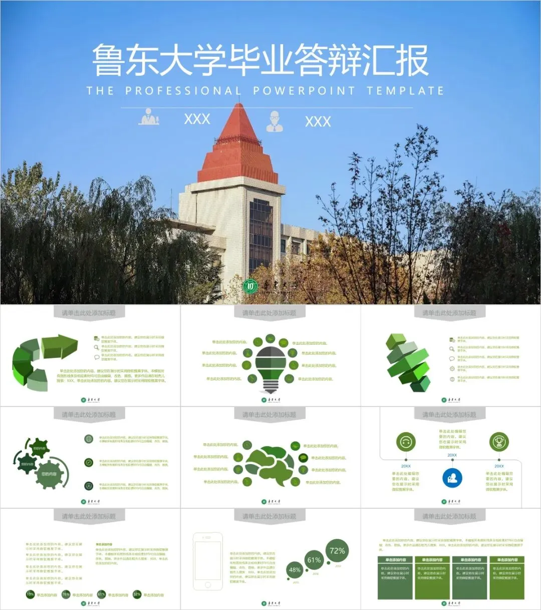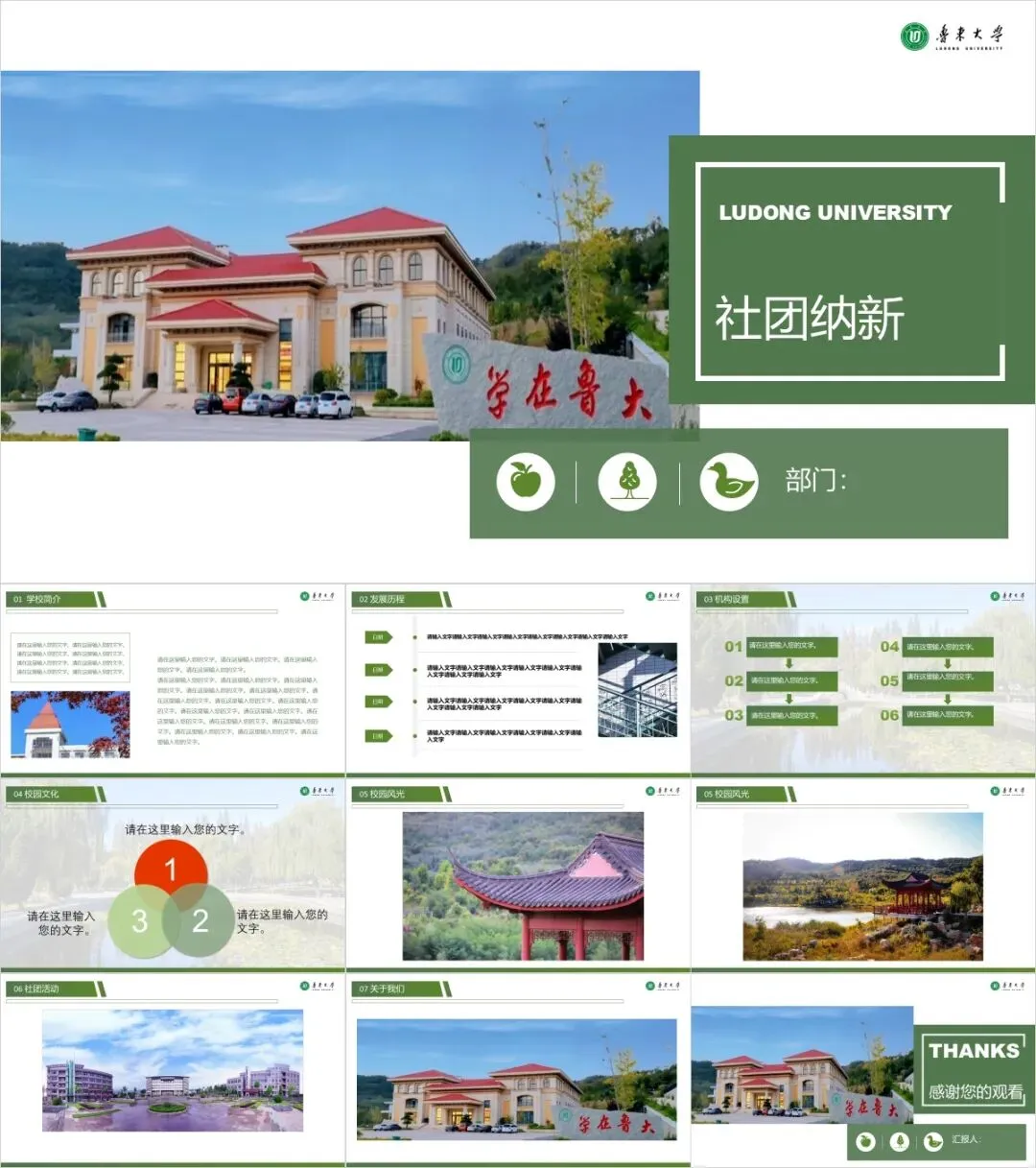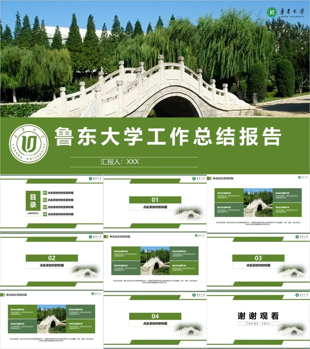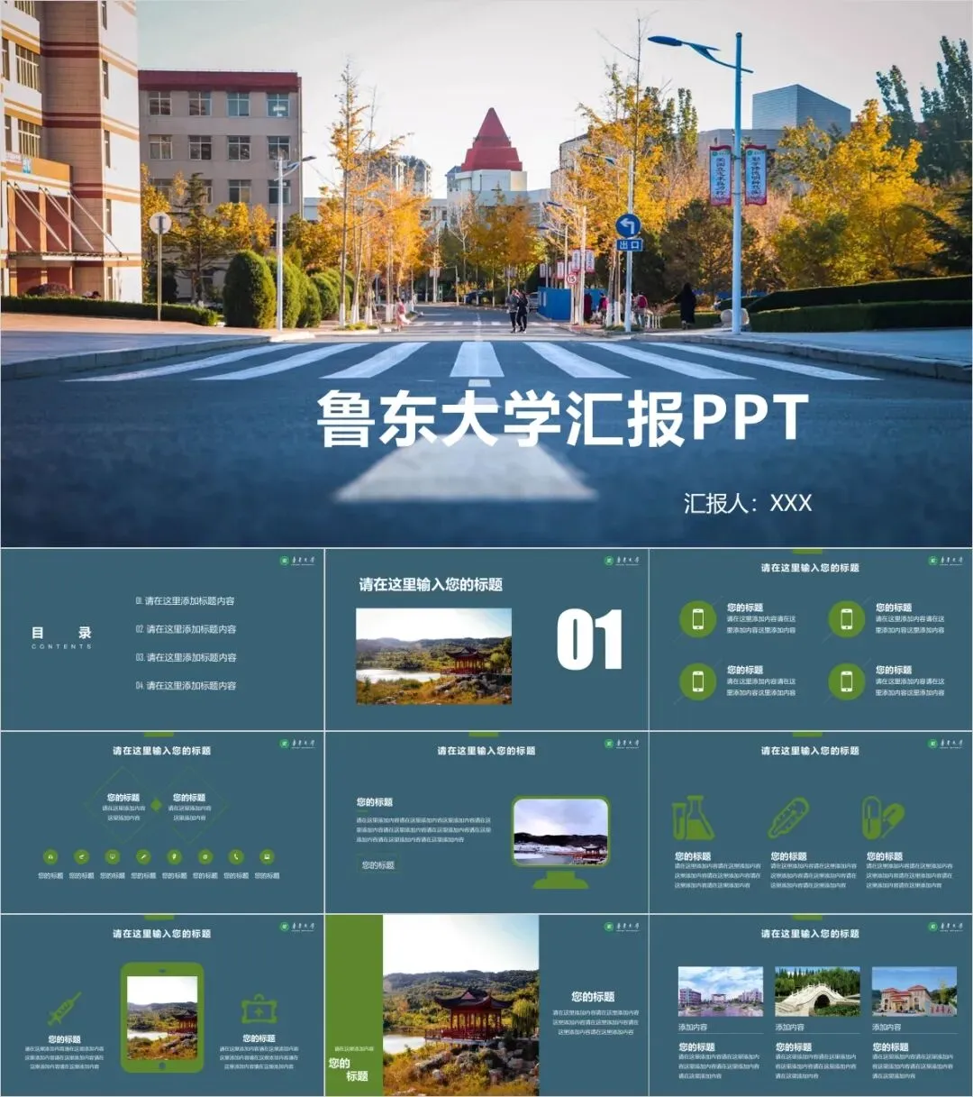 以上是我们为大家准备的鲁东大学专属PPT模板,文中的所有板式都是可编辑的,大家可以上传替换自己喜欢的校园美景,做出具有自己风格的专属PPT哦!其他同学也可以给我留言