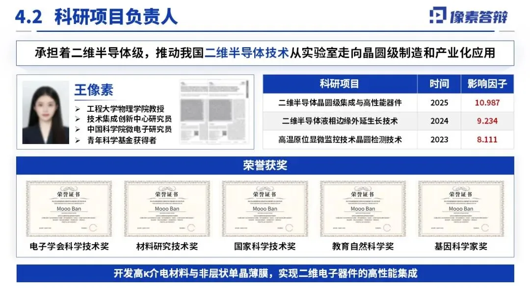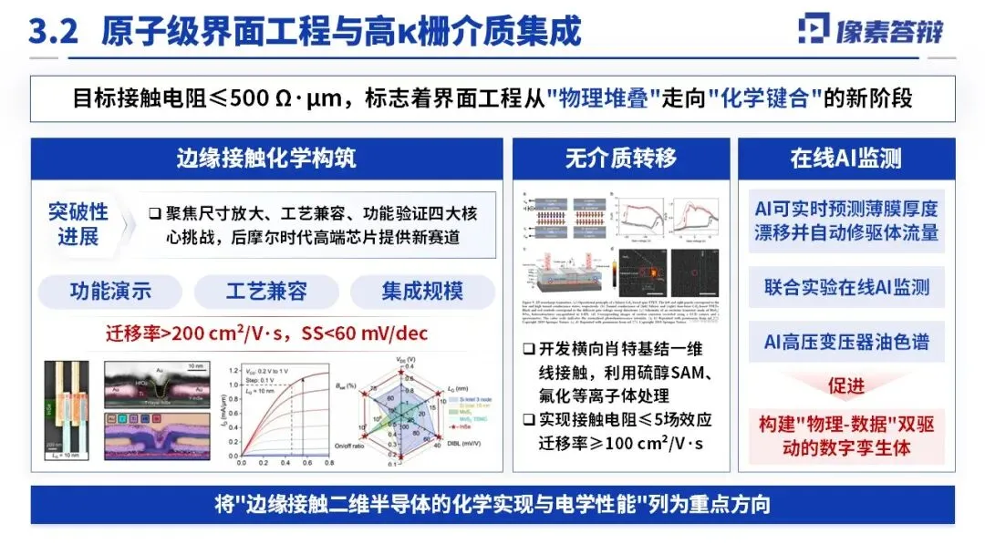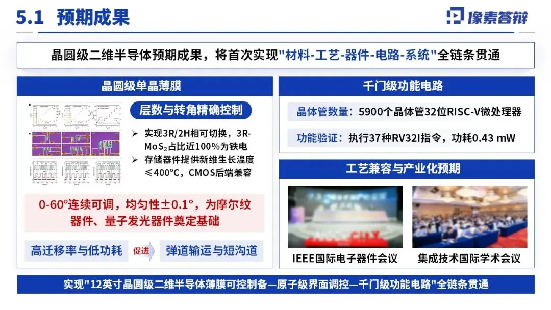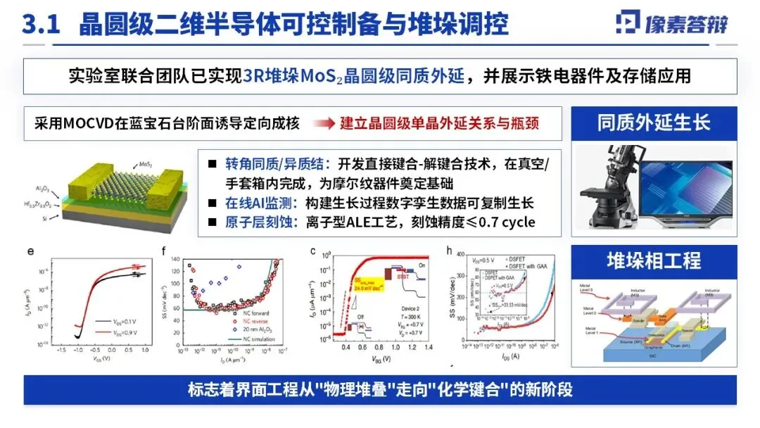 围绕 “薄膜可控制备 - 原子级界面调控 - 千门级功能验证” 全链条,分解为五大课题。关键技术突破包括:12 英寸单晶薄膜制备(畴尺寸 > 500μm,覆盖率 > 99%)、真空直接键合转移技术(无聚合物残留)、高 κ 栅介质原位集成(界面态密度 < 10¹⁰ cm⁻² eV⁻¹)、N/P 型精准掺杂与低阻接触(迁移率≥100 cm²/V・s),且工艺兼容 CMOS(温度≤400℃),同步开发 AI 在线监测优化生长过程。