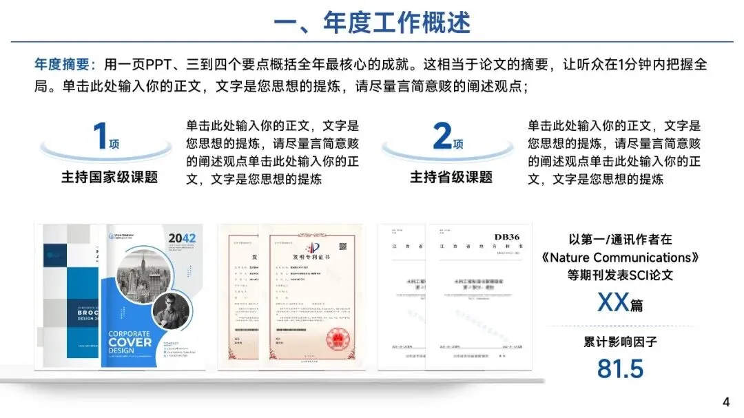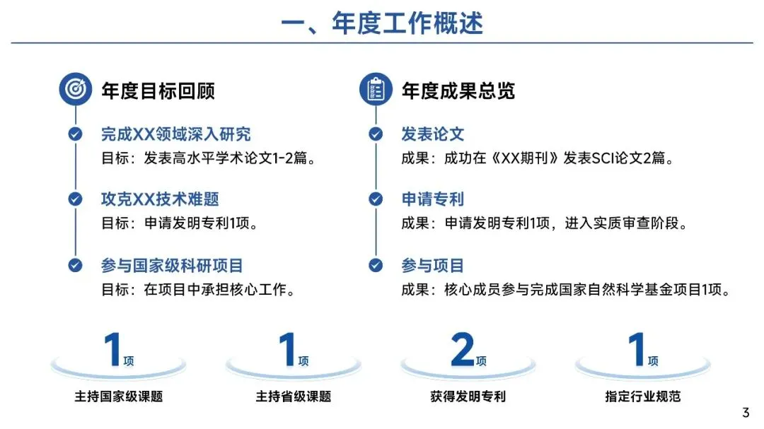 第一页部分:年度工作概述 — 绘制科研全景图