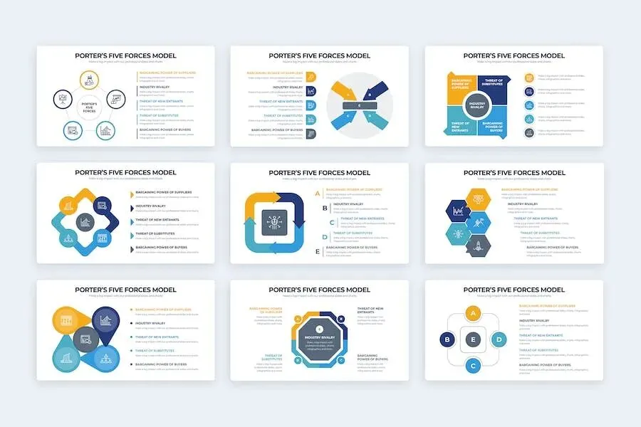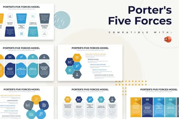 波特五力模型战略分析信息图形PPT模板,本套模板由顶尖PPT提供下载,模板支持PPTX等格式,适用于图形、分析、战略、信息、模型、波特、五力等类型的需求。模板尺寸规格为1920×1080。效果预览图中的配图仅作示意,源文件不包含。下载即可获可编辑的源文件,轻松定制,满足您的多样化需求。