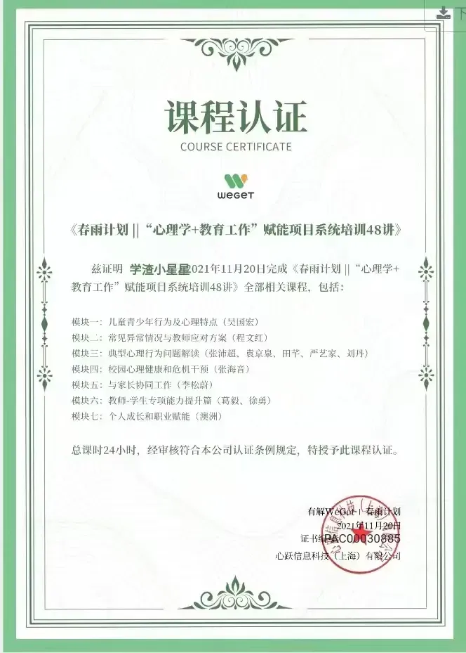课程结束后,颁发的电子版培训证书。