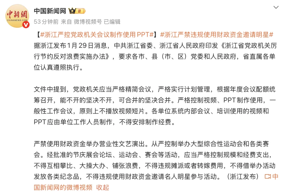 浙江发布1月29日消息,中共浙江省委、浙江省人民政府印发《浙江省党政机关厉行节约反对浪费实施办法》,要求各市、县(市、区)党委和人民政府,省直属各单位认真遵照执行。