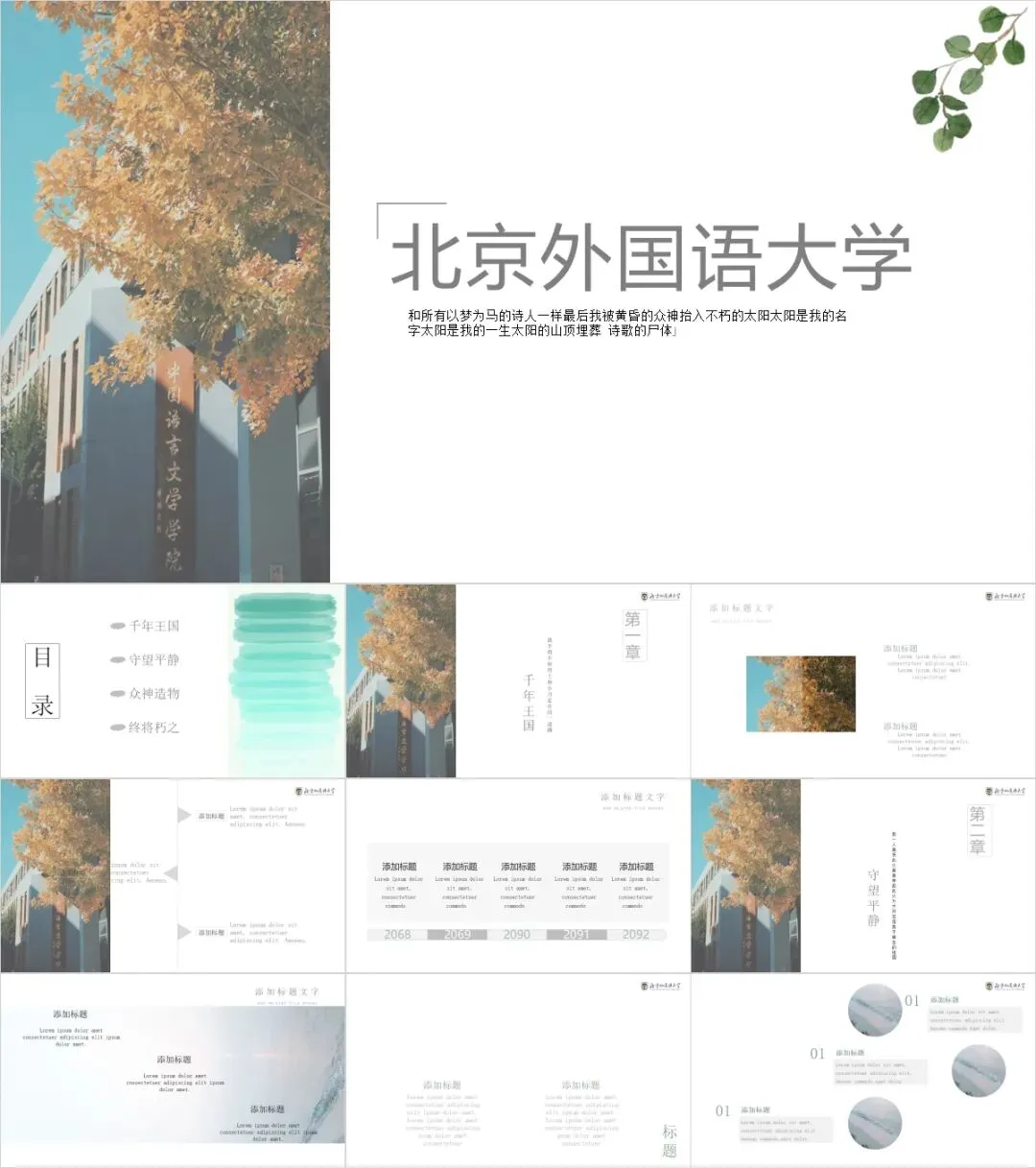 以上是我们为大家准备的北京外国语大学专属PPT模板,文中的所有板式都是可编辑的,大家可以上传替换自己喜欢的校园美景,做出具有自己风格的专属PPT哦!其他同学也可以给我留言
