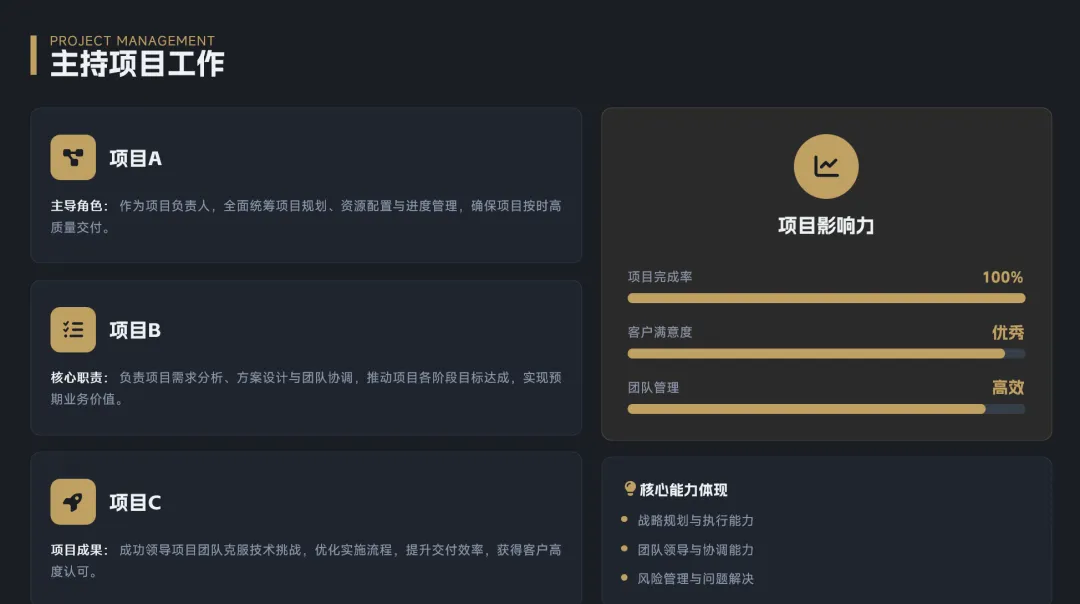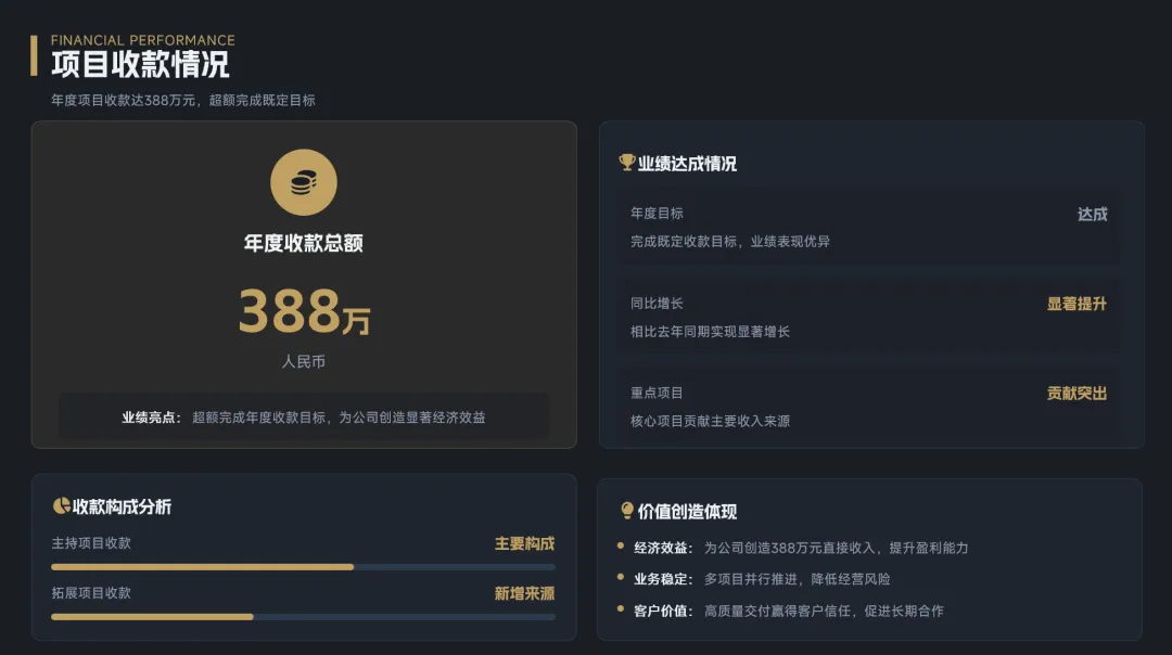 创作能力:人工智能地补充了笔者提供的word文件中没有写的“项目完成率”“客户满意度”“团队管理”进度条。