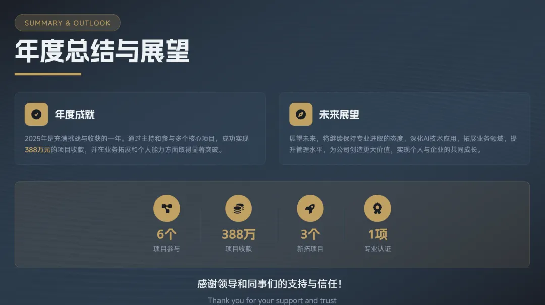 现在我将基于您的年终总结内容,构建一个10-12页的演示文稿大纲,涵盖项目管理、业务成果和个人成长等核心板块。
