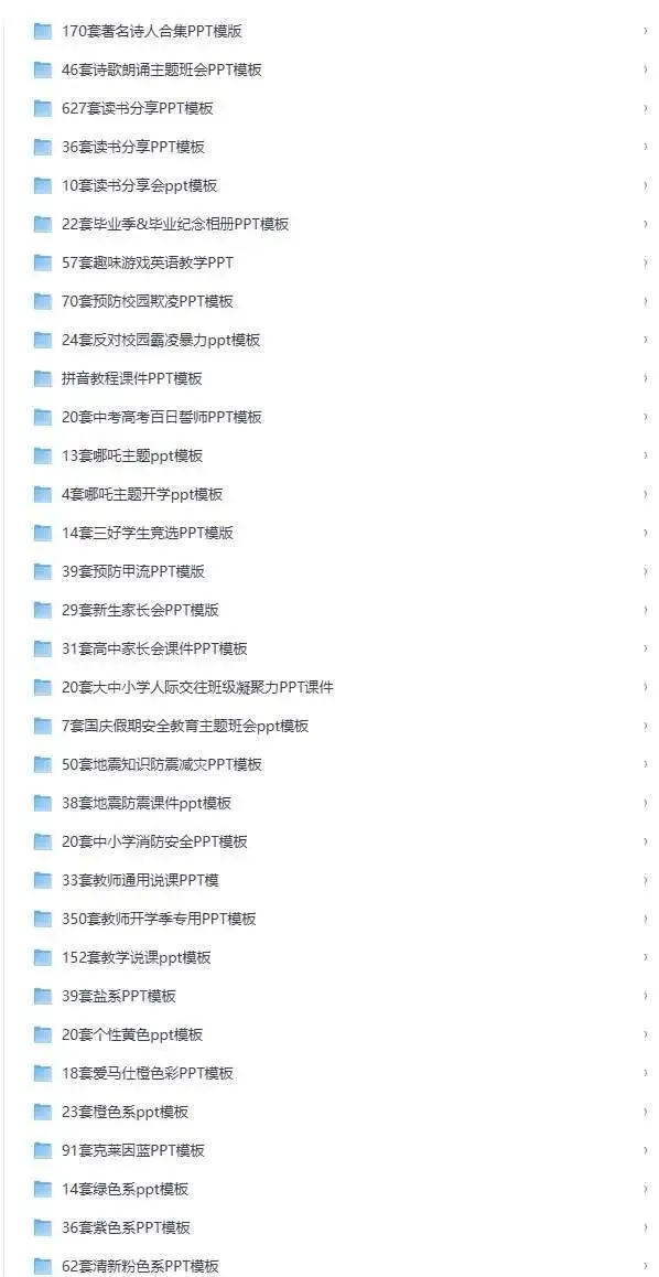- 教学课件模板:涵盖57套趣味游戏英语教学PPT、拼音教程课件PPT模板、7套国庆假期安全教育主题班会ppt模板、20套中小学人际交往班级凝聚力PPT课件等,风格兼顾趣味性与专业性,适合教师备课、课堂展示使用。