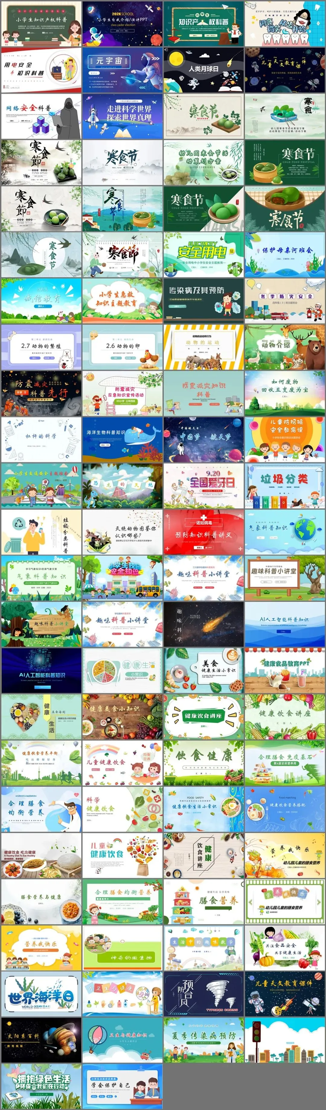 包括了:小学生知识产权科普PPT、星空主题小学生自我介绍演讲PPT、知识产权科普PPT、微笑从赤开始PPT、用电安全知识科普PPT、元宇宙PPT、人类月球日PPT、儿童天文教育课件PPT、网络安全科普PPT、走进科学世界探索世界真理PPT、寒食节PPT、幼儿园寒食节活动策划PPT、安全用电PPT、保护母亲河班会PPT、诚信教育PPT、传染病及其预防PPT、小学生急救知识教育PPT、冬季防火安全PPT、动物的繁殖PPT、动物的卵PPT、动物的运动PPT、动物介绍PPT、防震减灾科普先行PPT、杠杆的科学PPT、海洋生物科普知识PPT、中国梦航天梦PPT、儿童防拐骗PPT、垃圾分类PPT、预防知识科普讲义PPT、趣味科普小讲堂PPT、气象科普知识PPT、AI人工智能科普知识PPT、健康生活PPT、健康饮食讲座PPT、合理膳食均衡营养PPT、儿童健康饮食PPT、世界海洋日PPT、预防台风PPT、太阳系百科PPT、夏季传染病预防PPT、学会保护自己PPT等。