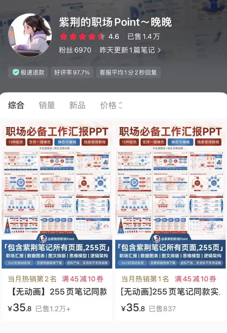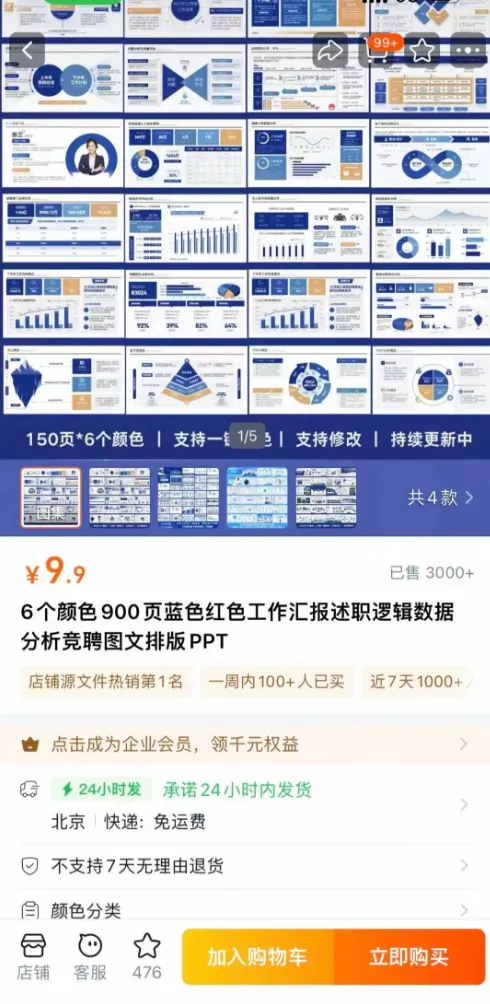 买回来之后,不用原封不动用,改改配色、调调字体,再重新命名,比如把“通用工作汇报”改成“领导满意的工作汇报模板”,就可以直接卖,既节省时间,又不用费脑子