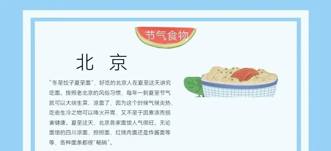 “冬至饺子夏至面”是广泛流传的习俗。夏至吃面有尝新之意,因新麦登场,面条成为应季美食。北方多食打卤面、炸酱面,南方则有阳春面、三鲜面等,吃凉面可降火开胃。