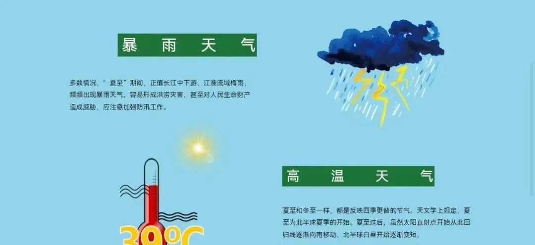 部分地区可能出现持续高温、干旱或强对流天气(如冰雹、大风),需防范中暑、干旱及灾害性天气对农业和生活的影响。总体而言,夏至标志着盛夏正式来临,气候以高温、高湿、多雷雨为典型特征,需注意防暑降温、防雨防涝及应对极端天气。