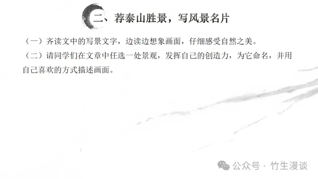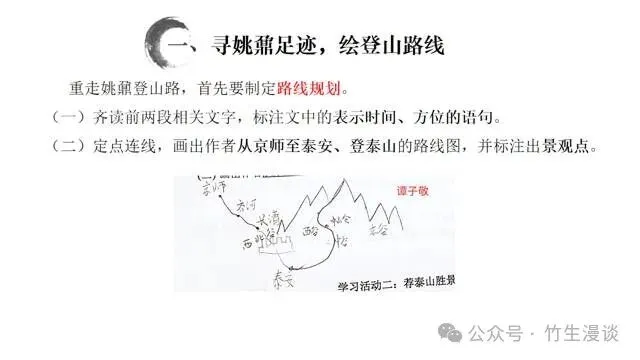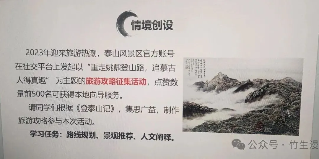 故本课计划以设计旅游攻略为线索,引导学生熟悉文章内容,掌握基本文言现象,用读写任务激发学生对泰山风光的想象,进而使学生自然生成对姚鼐《登泰山记》中情感的个性化体悟。