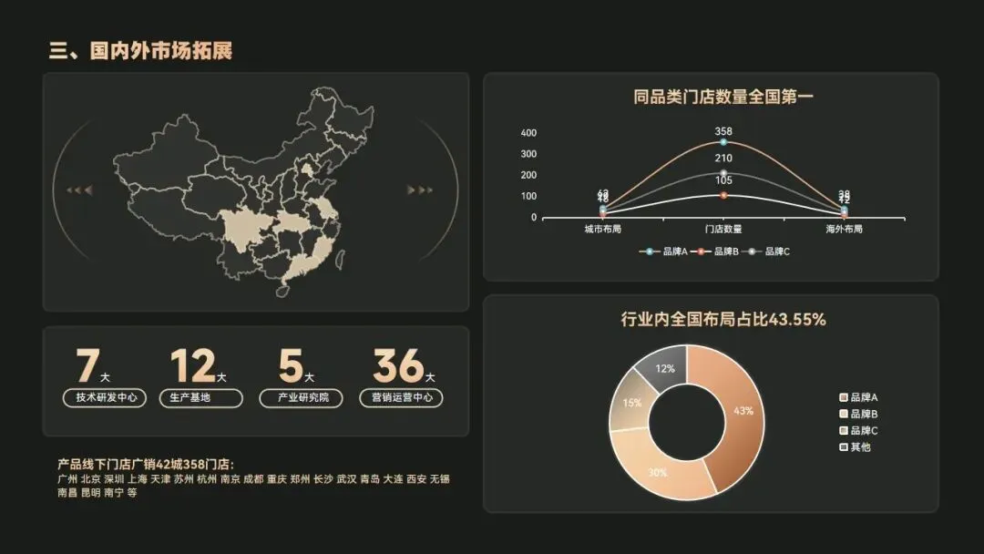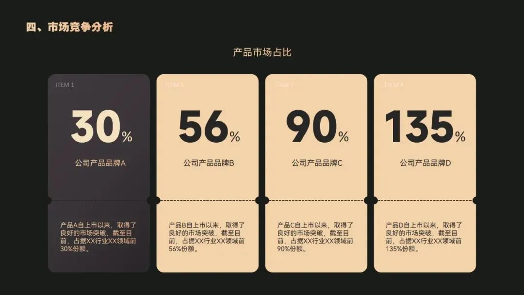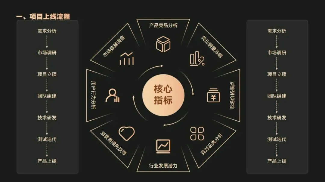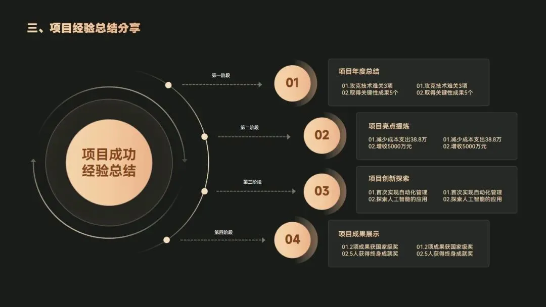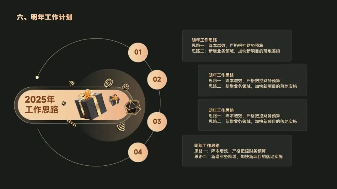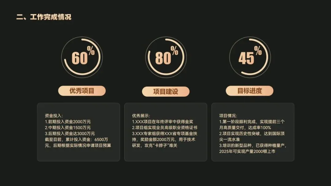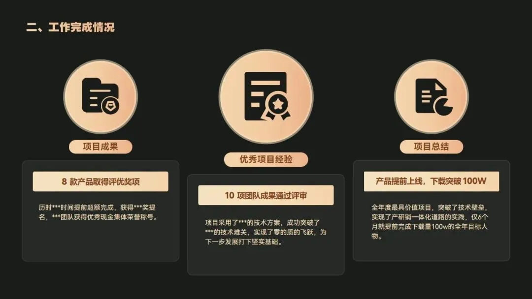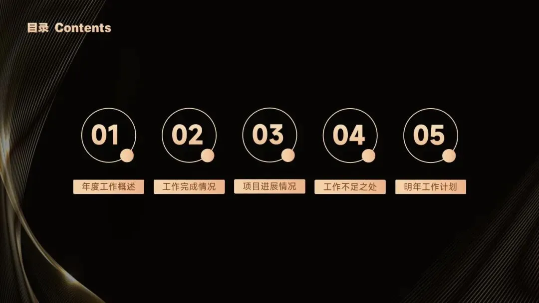 这套模版可以完全满足日常职场汇报项目管理数据总结等场景使用,内容可替换可编辑,黑金质感模版PPT