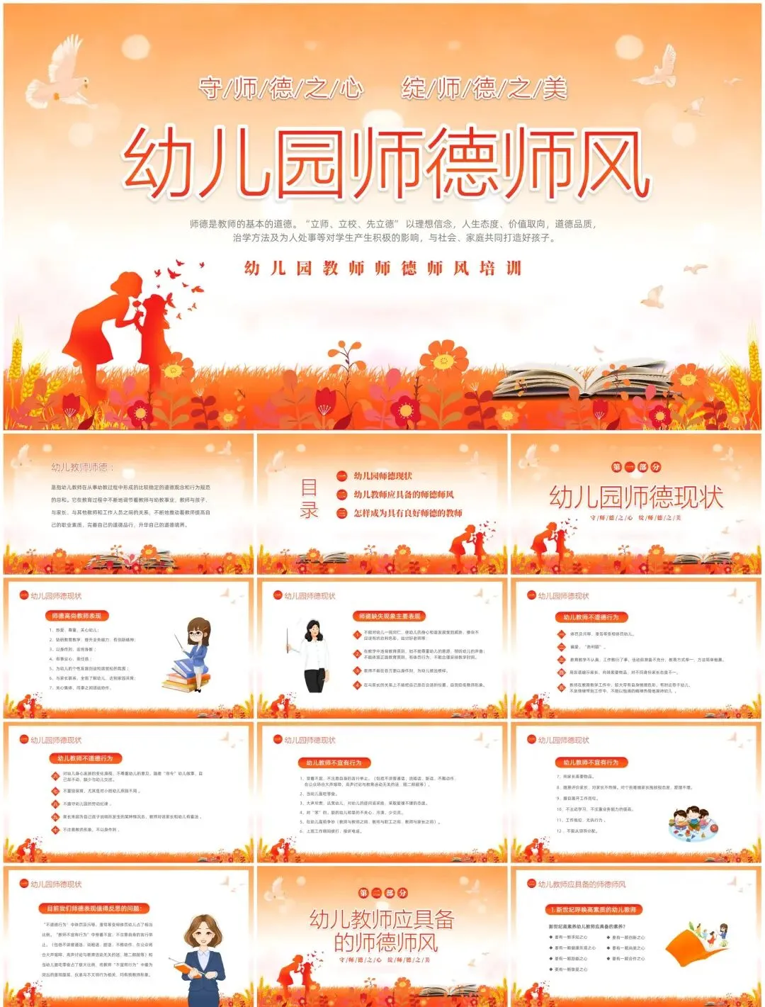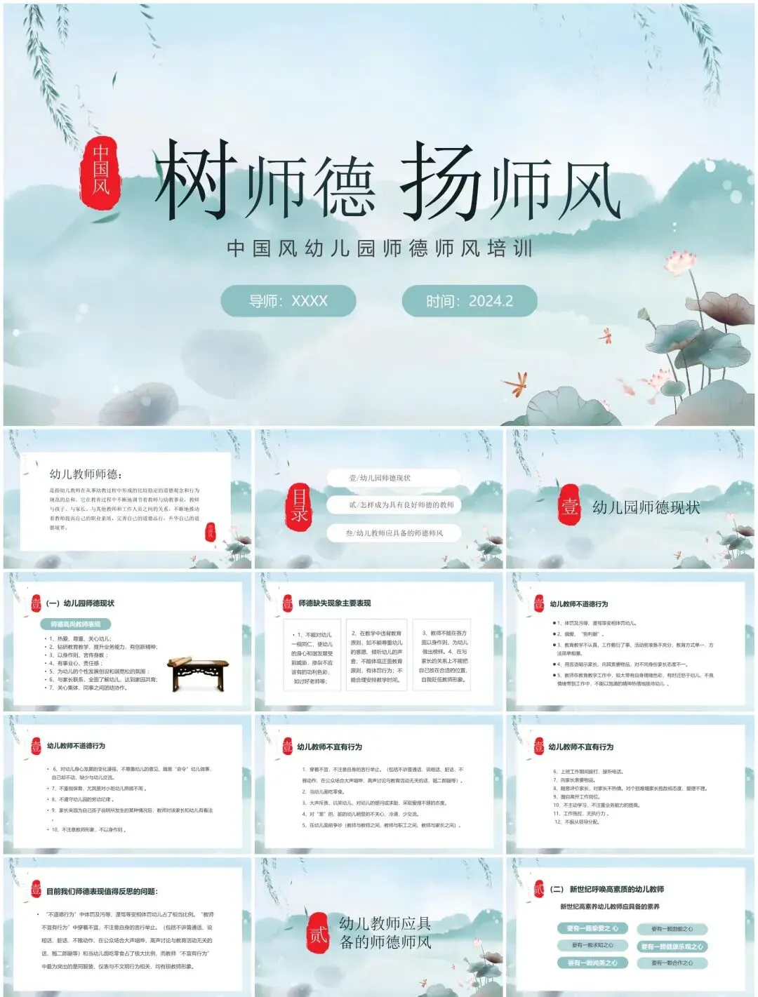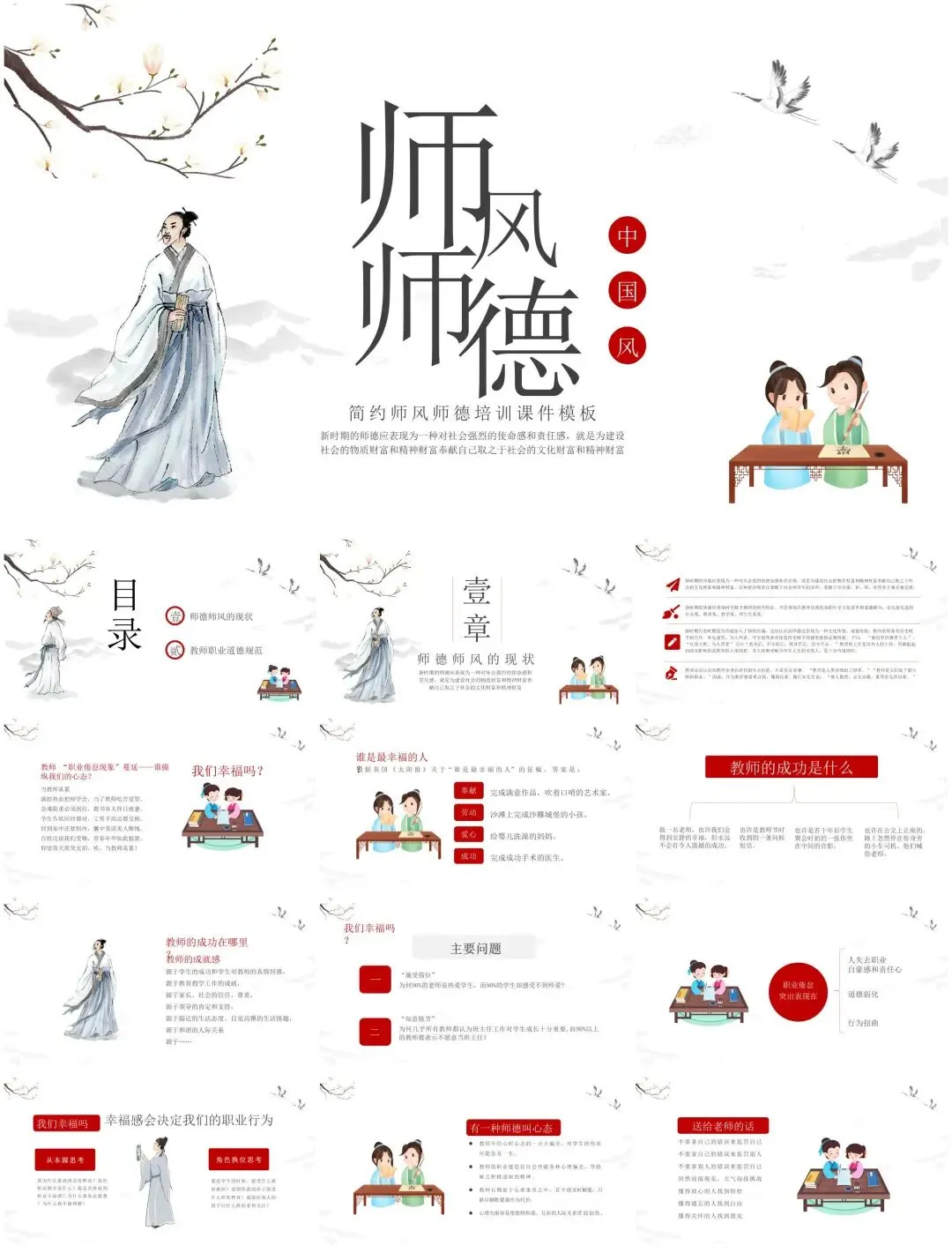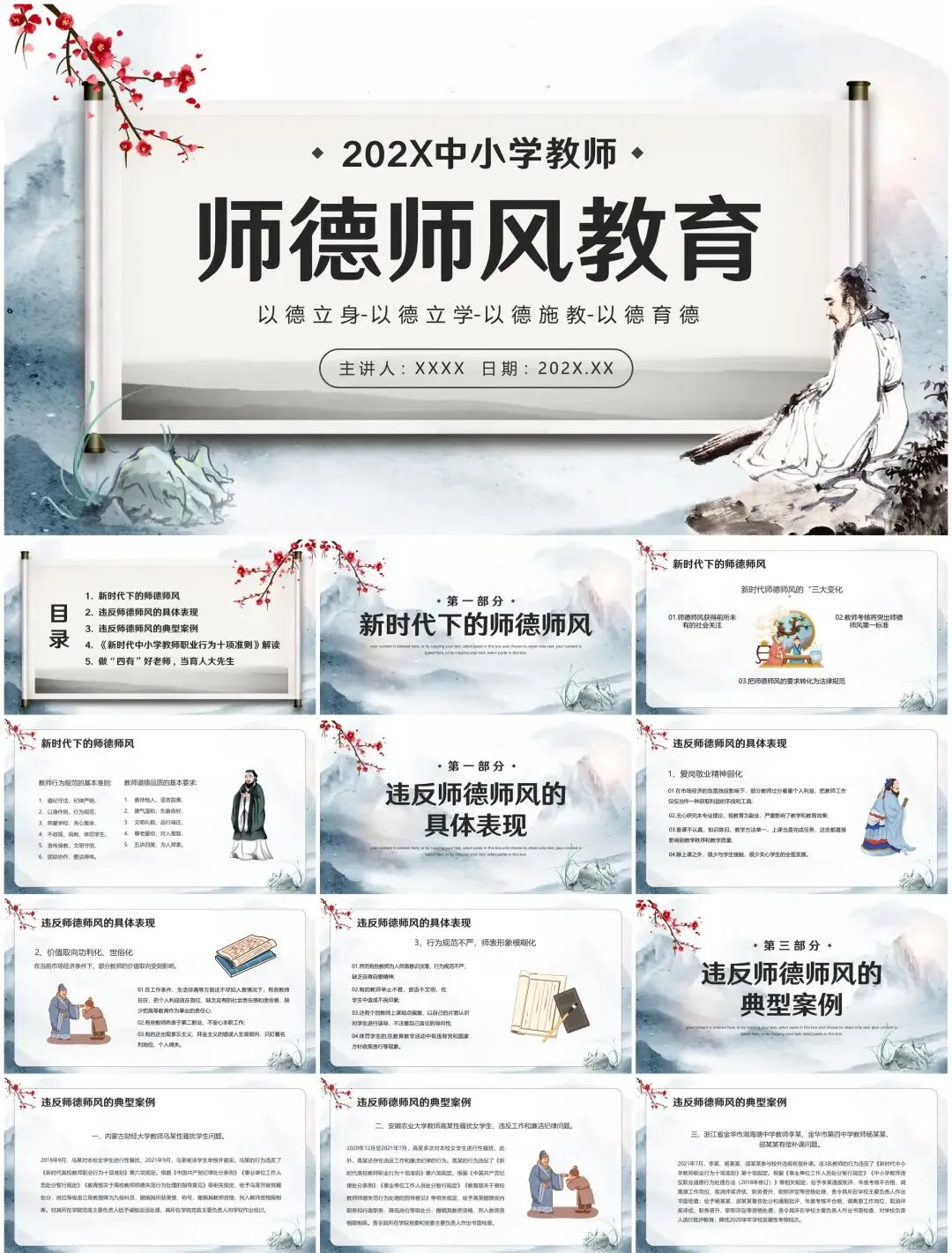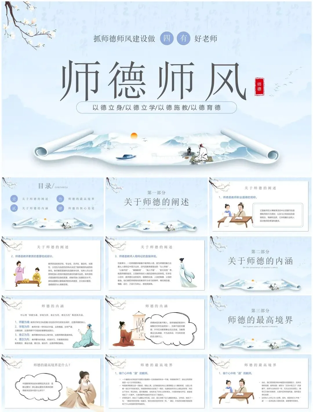 从"四有"好老师标准可视化图表到教育家精神金句动态展示,从师德警示案例互动模块到师生暖心故事时间轴——这套【教师专属模板】用青竹、砚台等教育意象,打造有温度的职业素养培训课件。