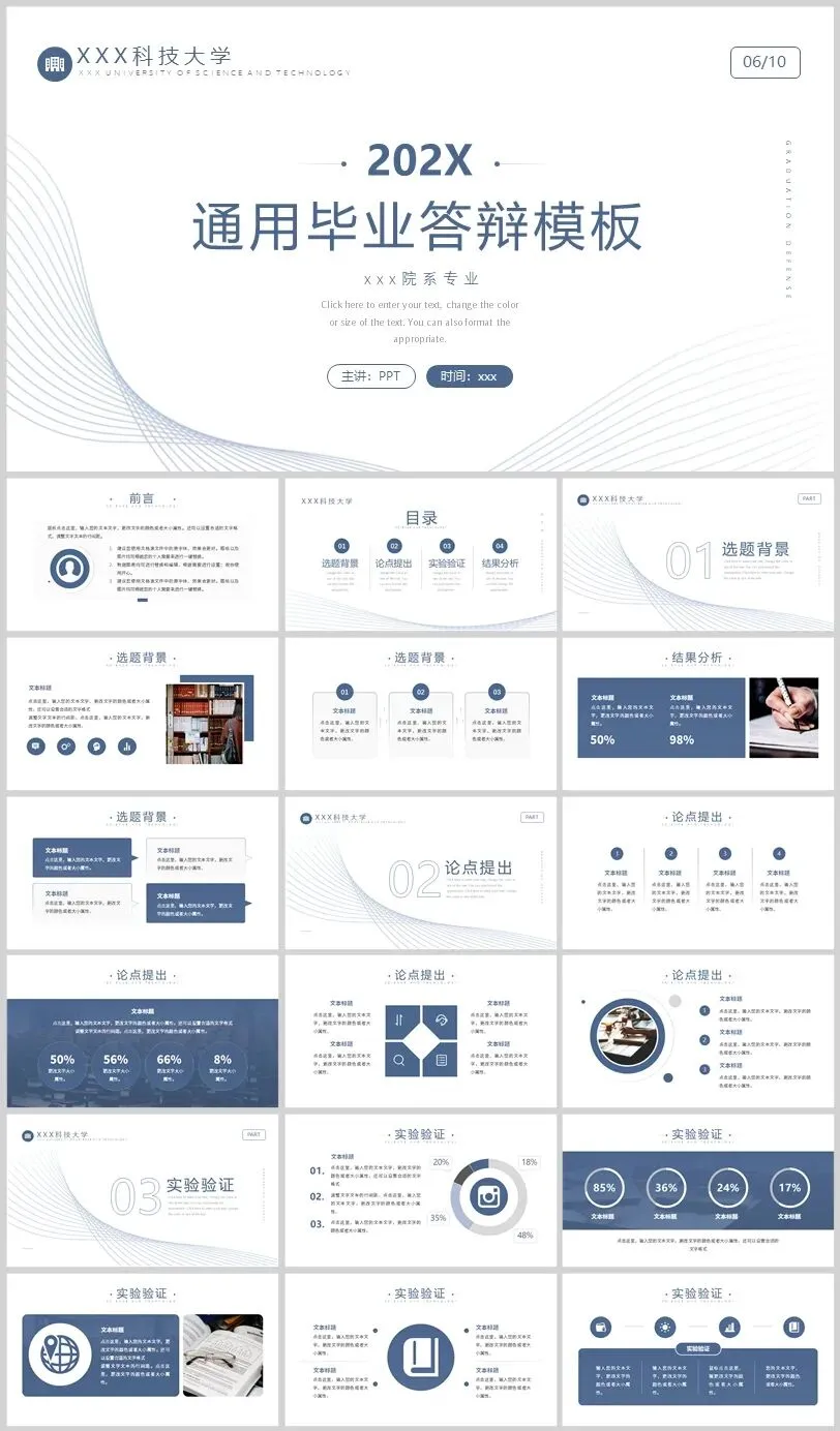 大家好,今天带给大家一套通用毕业答辩PPT模版,需要这种PPT模版的朋友千万不要错过,本期资源免费下载,获取方式在文章结尾。以上,就是今天分享给大家的PPT模板部分内容预览图,完整内容大家领取后慢慢欣赏吧。友情提示:请先将模板保存到自己的网盘或下载后再操作,模板下载后请在电脑上用PPT或者WPS编辑,不建议手机操作PPT文件。本期资源来源网络平台,仅供大家交流学习,不支持商用,请知晓!