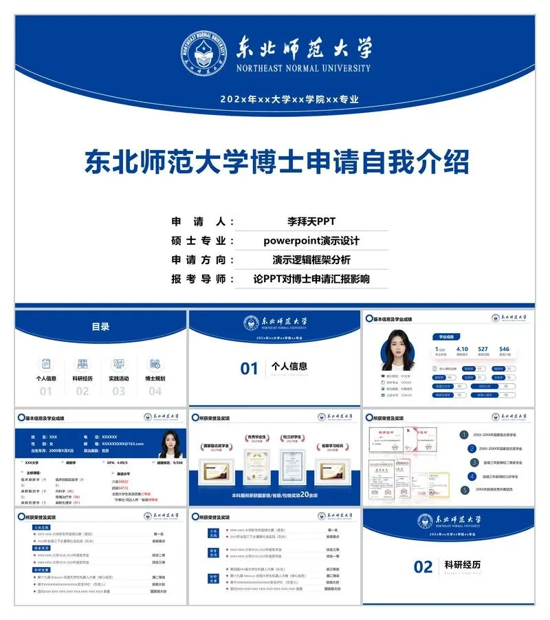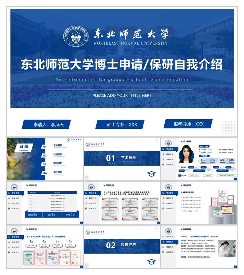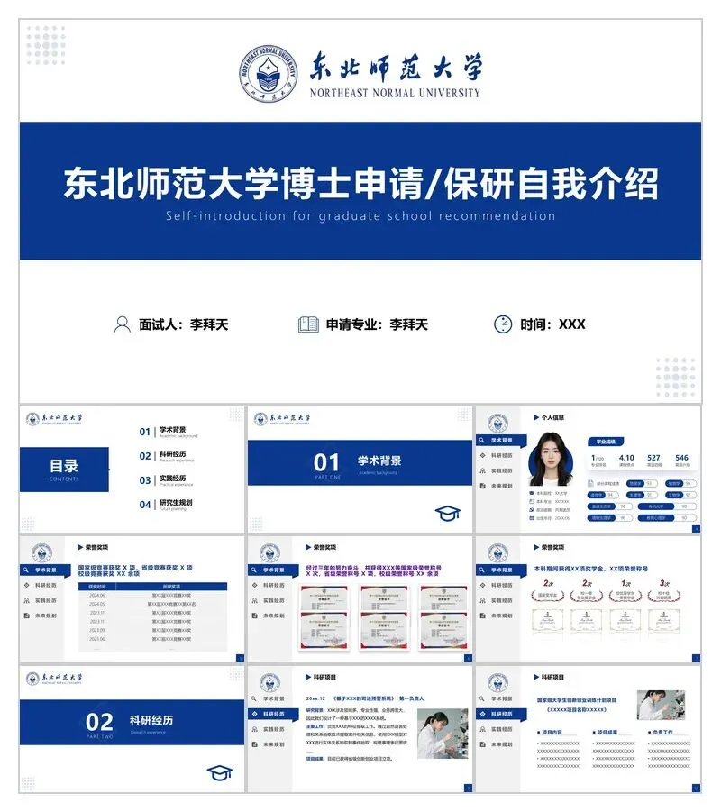 针对东北师范大学博士申请(兼保研通用),我们打磨了4套定制化PPT模板,完美契合东师视觉体系,覆盖学术背景、科研经历、实践成果、博士规划四大核心模块,帮你省去排版烦恼,把精力聚焦在学术本身!