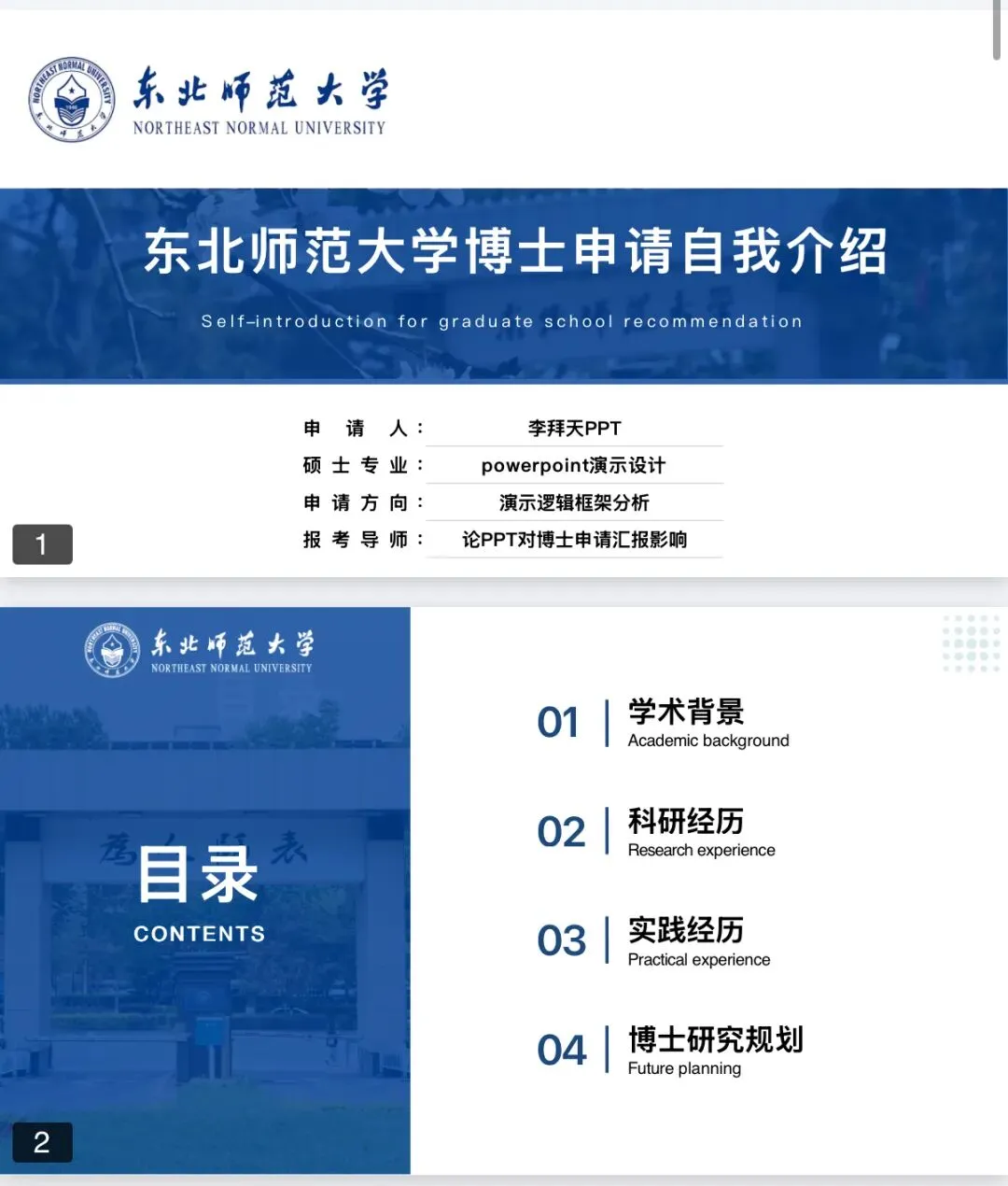 深度匹配东北师范大学校徽色系,以经典蓝白为主调,融入校徽、校园实景等元素,辨识度拉满,瞬间拉近与导师的距离。