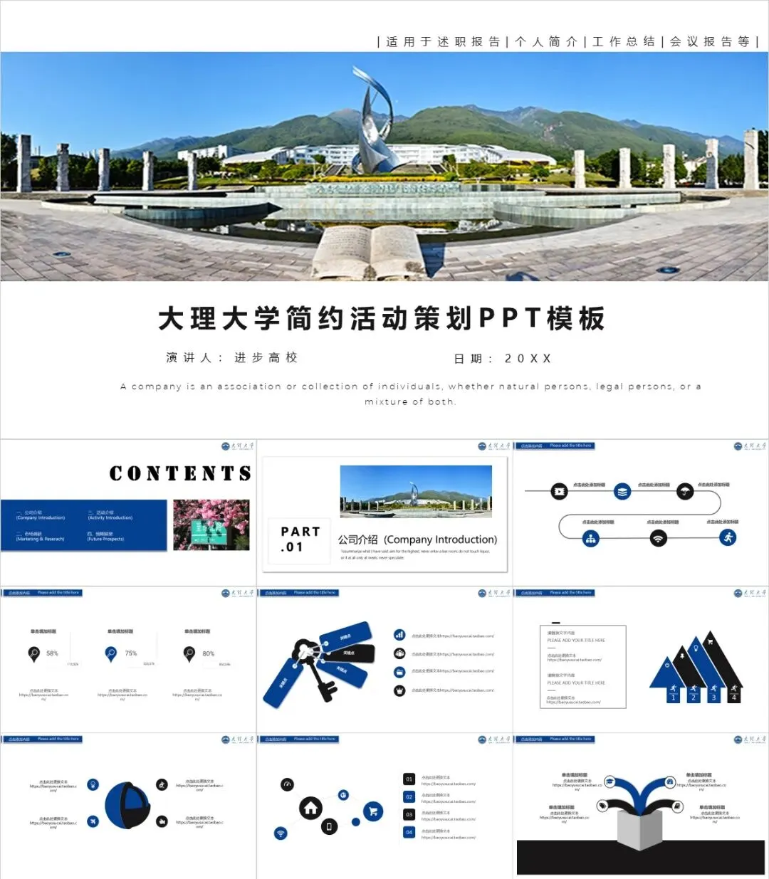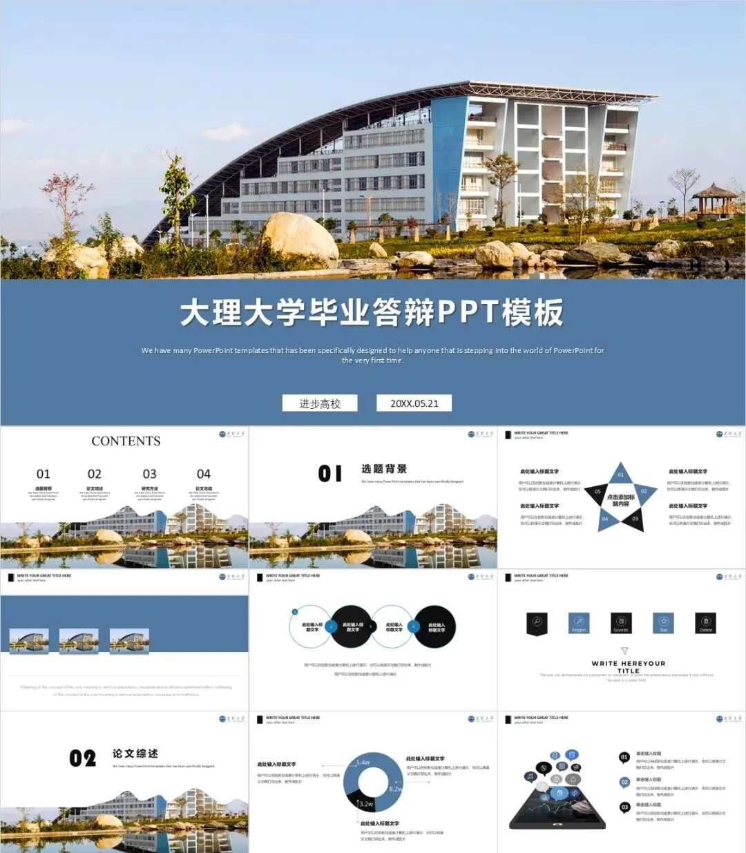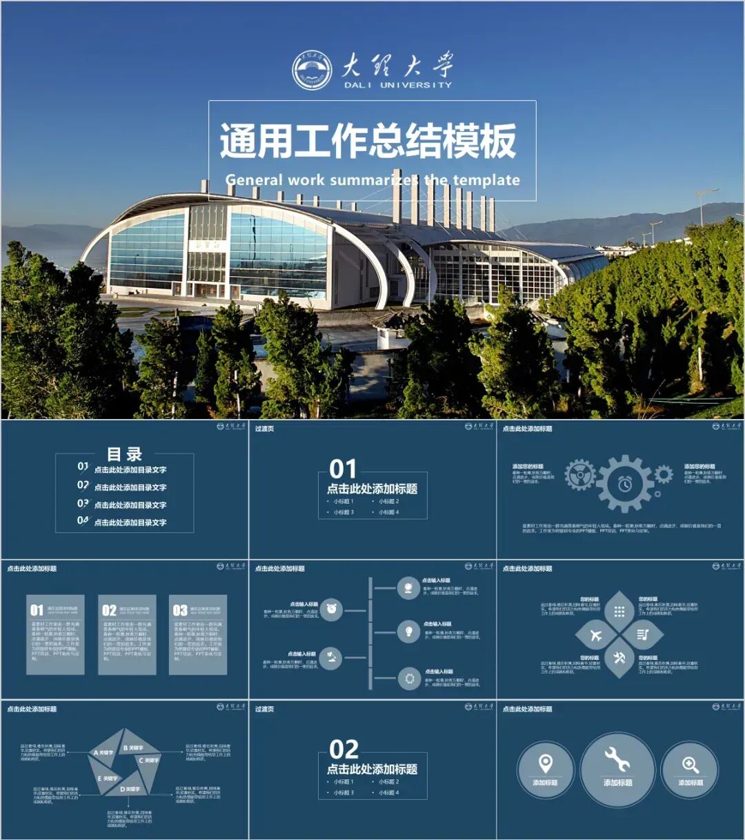 以上是我们为大家准备的大理大学专属PPT模板,文中的所有板式都是可编辑的,大家可以上传替换自己喜欢的校园美景,做出具有自己风格的专属PPT哦!其他同学也可以给我留言