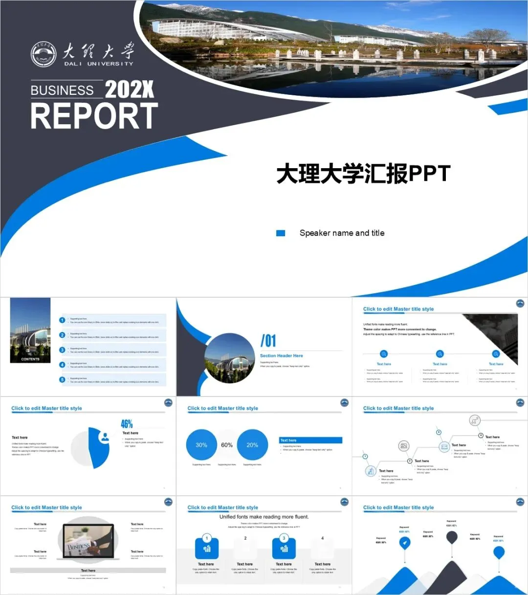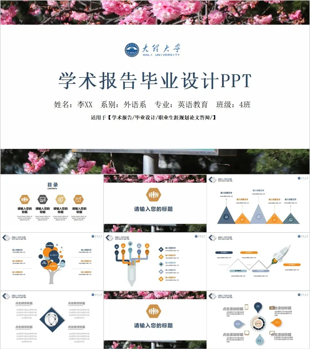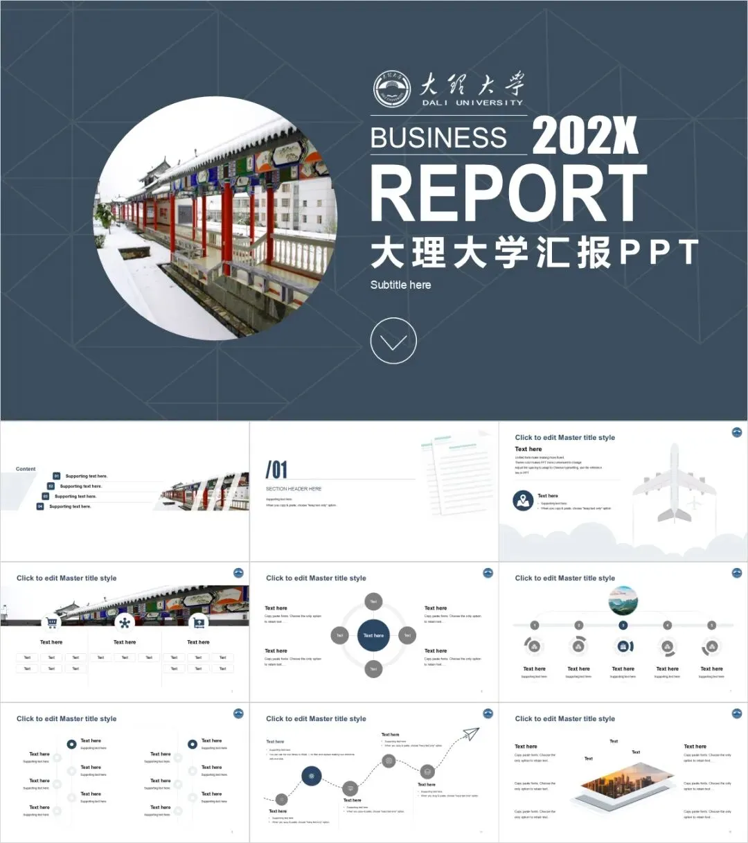 以上是我们为大家准备的大理大学专属PPT模板,文中的所有板式都是可编辑的,大家可以上传替换自己喜欢的校园美景,做出具有自己风格的专属PPT哦!其他同学也可以给我留言
