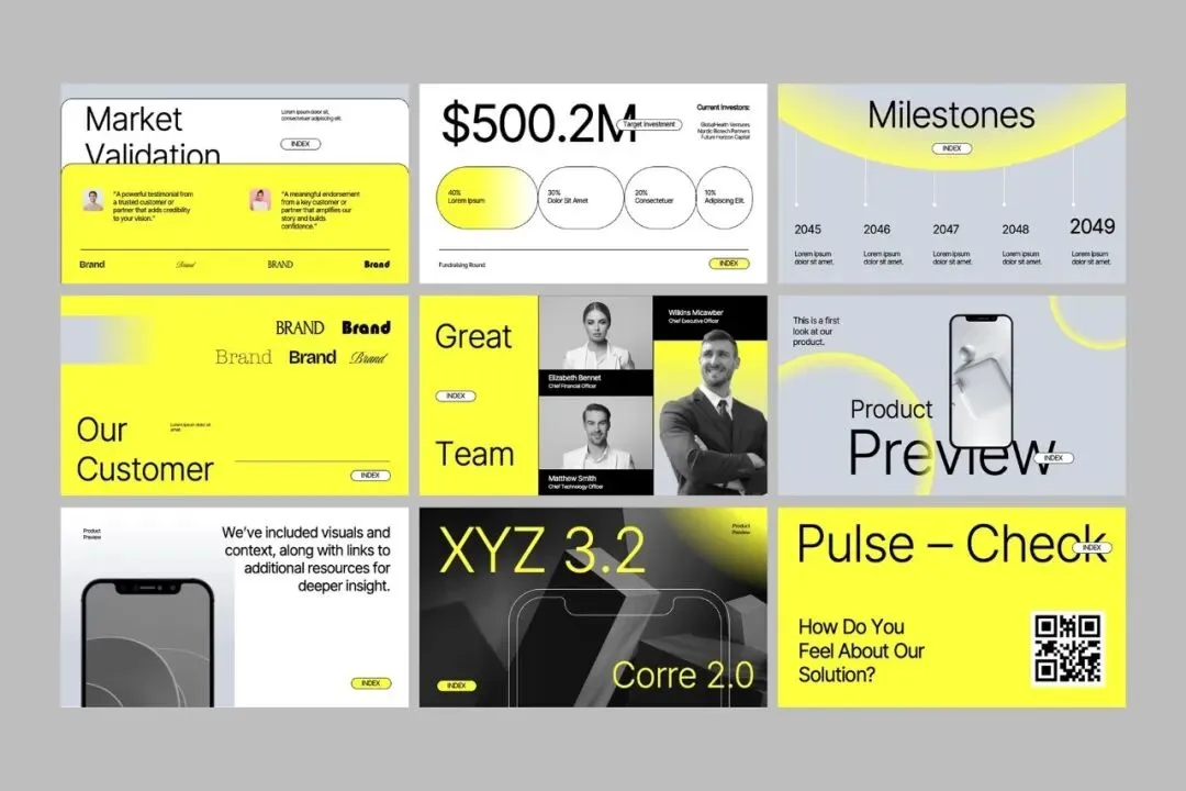 用互动变形现代提案简报 ——一个为初创企业、科技公司和创意机构设计的动态模板,改变你的商业演示。它采用鲜艳的黄色调、干净的渐变和极简布局,将活力与专业精神完美结合。