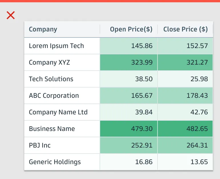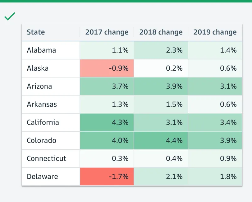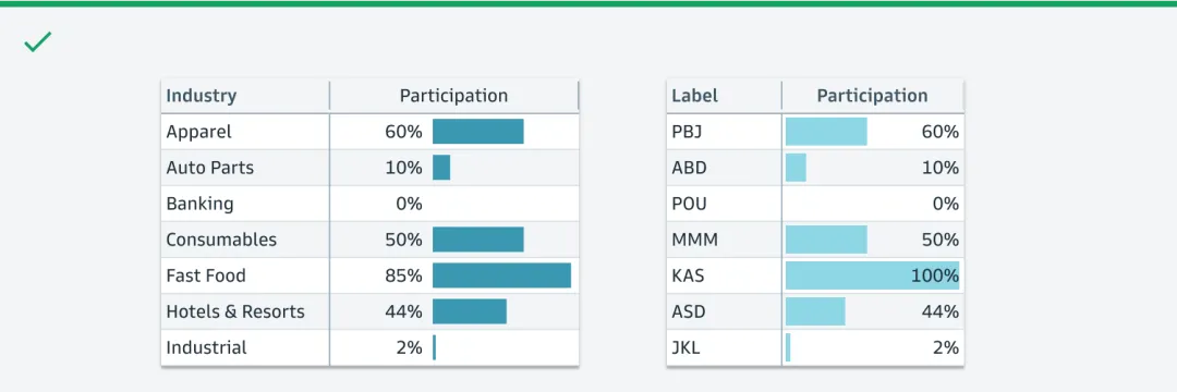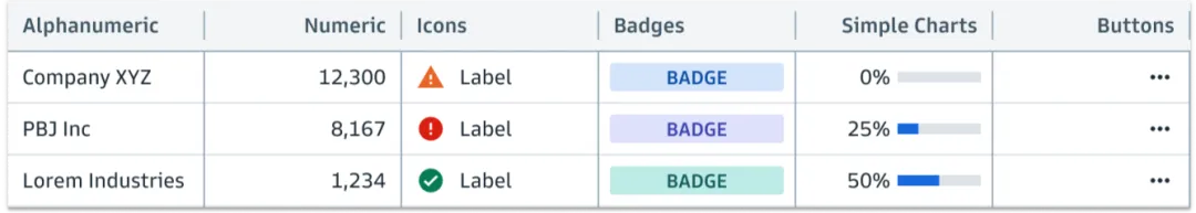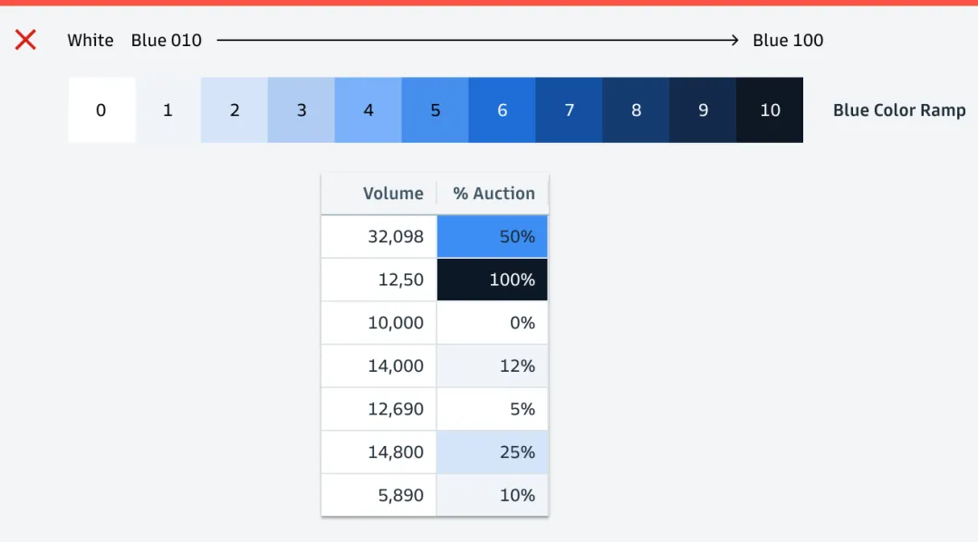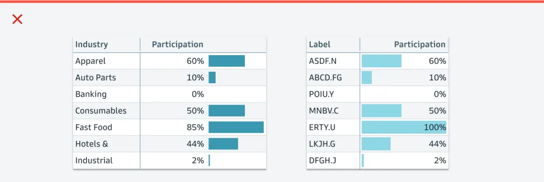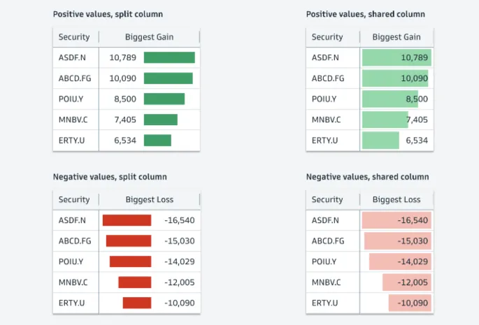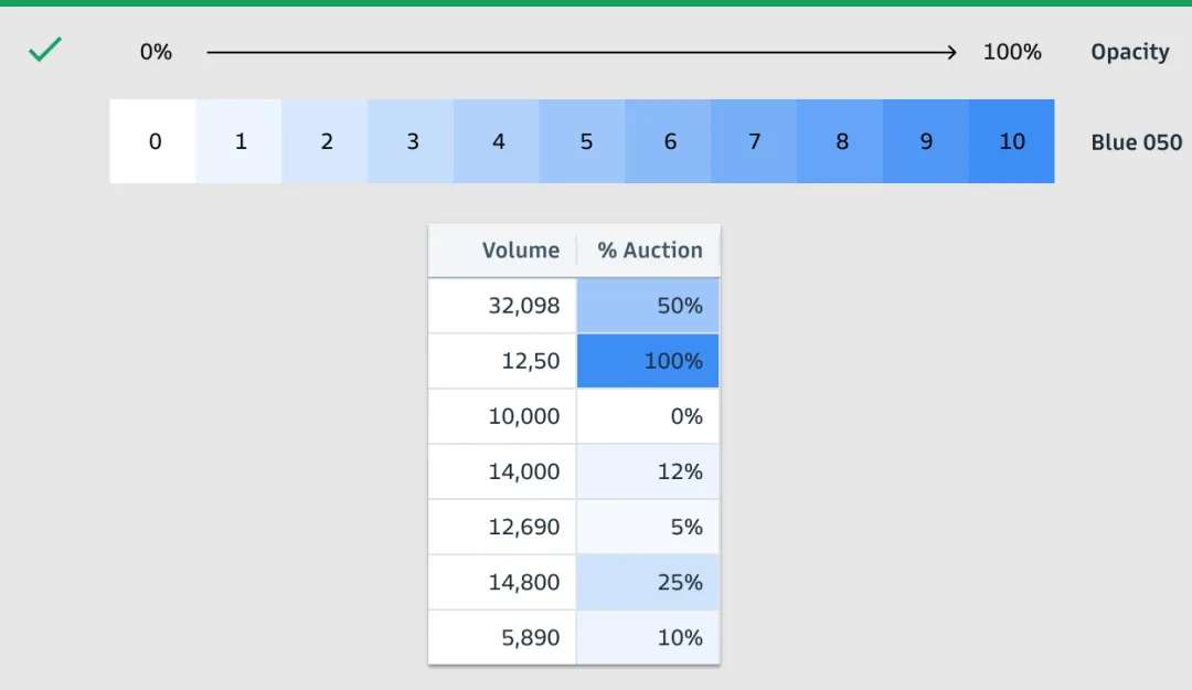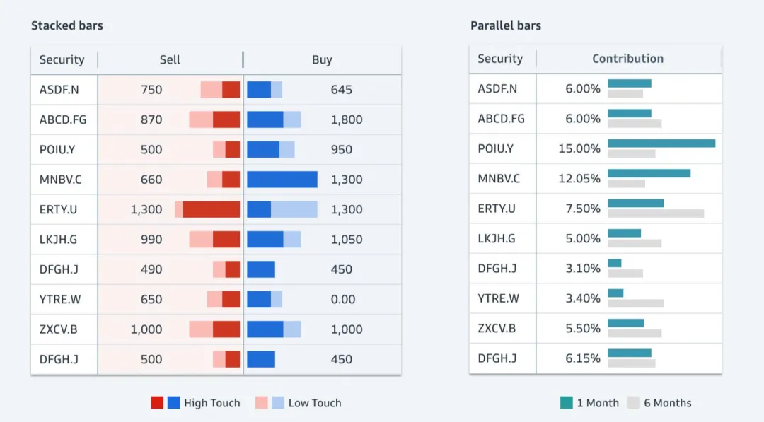 首先,高盛点明了5大设计原则:以用户为首(Start with users);把复杂信息阐述清晰(Clarify complexity);为用户提供价值(Deliver value, not features);给用户赋能(Empower clients);一致化(Consistency, at scale)。热图是一个以颜色变化来展示数据的矩阵,能直接展现出值的大小和变化。高盛明确要求热图里的数据必须有关联(存在可比性/数据变化),不能用彼此无关的值来作图。比如左图里Open Price和Close Price之间不是比较型数据,无法做热图;右图里数值为每年的百分比变化,则可以作图。作为“强迫症的代表”,高盛要求在制图时,如是单色,就用该颜色透明度的不同程度来展示,避免使用其他颜色,否则看起来很乱,始终坚持“一致化(Consistency, at scale)”的设计原则。如是双色,那就是用这两个颜色透明度的不同程度来展示。看完对颜色要求很“苛刻”的热图后,我们再来看看对格式要求很“苛刻”的直方图。高盛给直方图的定位为“用一系列高度不等的条纹或线段表示数据分布情况”的图。在大多数情况下,数字要求与图形条的右侧对齐。只有在图形条和数据拆开展现,且数据为正数时,数字才需放在图形条的左侧(如下图中的左上)。结合表格呈现时,即使其他列的标题居左,但直方图的标题必须居中。因为直方图的标题包含了图形条和数值两部分,只有放在中间才不会引起歧义。此外,直方图可以灵活地组合网格中的两个值,用堆叠条形图(左图)、平行条形图(右图)等多种形式来展示。最后分享的是表格——最直接地体现高盛对数据的“苛刻”。在表格中,有7种主要的数据类型:字母数字、数值、图标、简单图表、日期和时间、按钮、徽章。 如果单个单元格里信息过多,需做省略展示时,对不同类型的文本高盛给出了不同的要求,突出一个最大程度地为用户传递有效价值(Deliver value):- 如果是文件路径,就前半部分省略,因为后面的路径更重要;