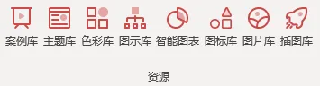 菜单栏里有 8 项资源库,分别是案例库、主题库、图示库、图标库、图片库、插图库、色彩库、智能图表库,我们接下来将具体介绍这些神奇的功能。