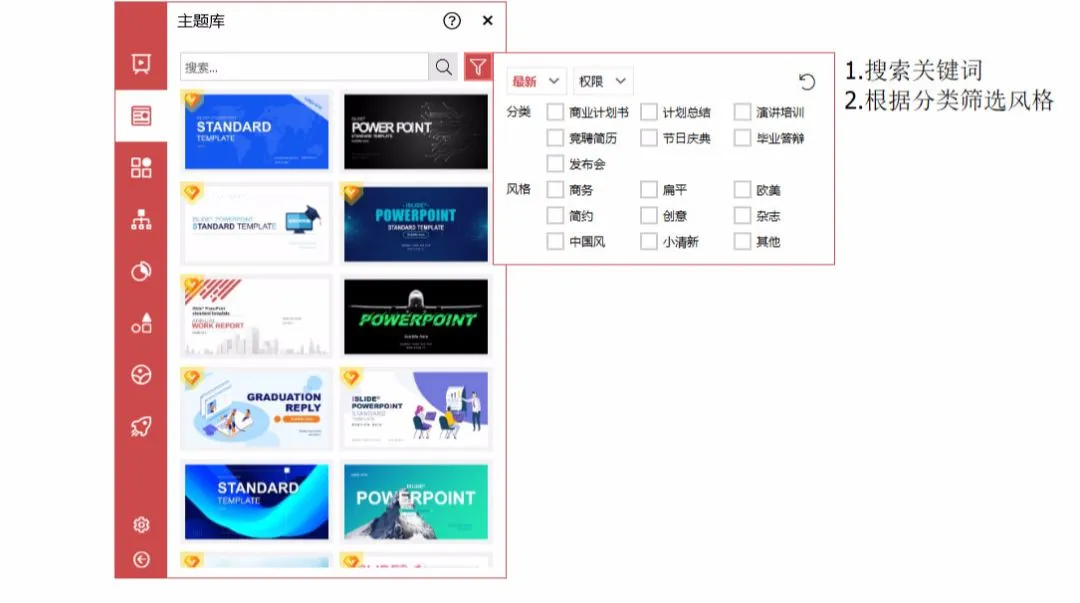其中第一个是主题库,它的存在就相当于一个风格库,为你的 PPT 打好一个风格基础,需要哪种 style 的模板直接在里面挑选,这样比在网上搜索模板节省很多时间,毕竟不是每一个模板都那么合适。