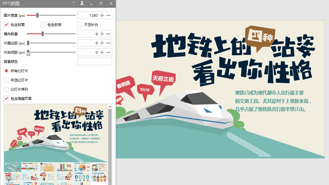 PPT 做好以后点击菜单栏的 PPT 拼图,可以导出单张图或者长图,第一时间把你的 PPT 呈现出来。