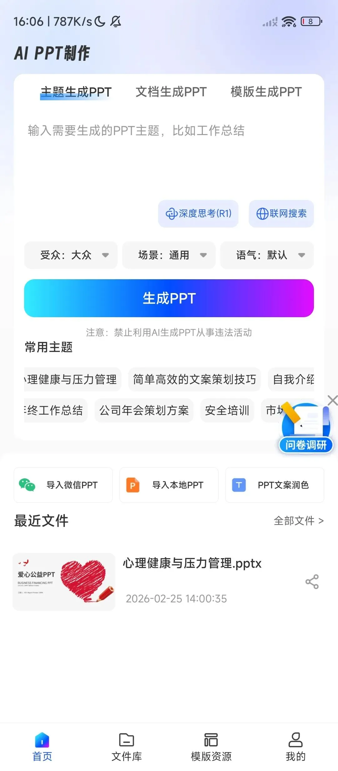 当前位置:首页>PPT制作>[工具分享]AI PPT制作师,一键生成高质量演示文稿.输入主题即可自动生成完整PPT3.1(三)