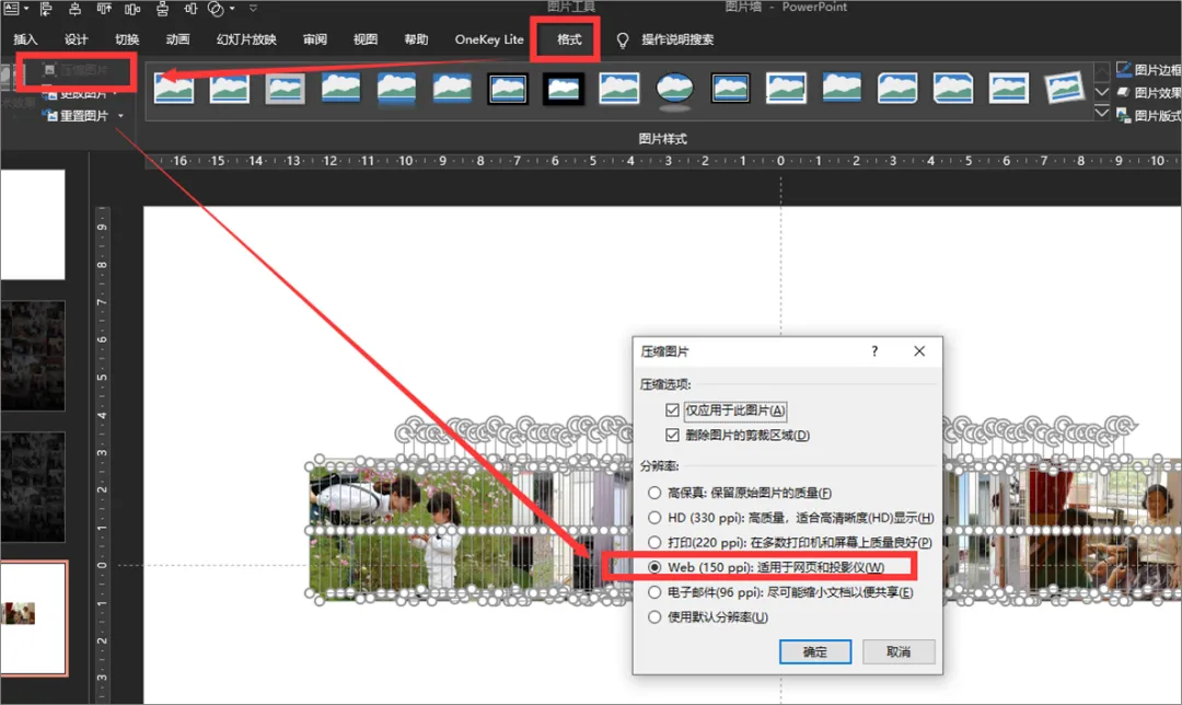 在【格式】选项卡下有个【压缩图片】,选择【Web】的分辨率就可以了