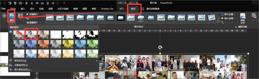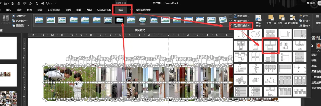 全选图片,在【格式】选项卡下,有个【图片版式】,这个能快速的对照片进行排版