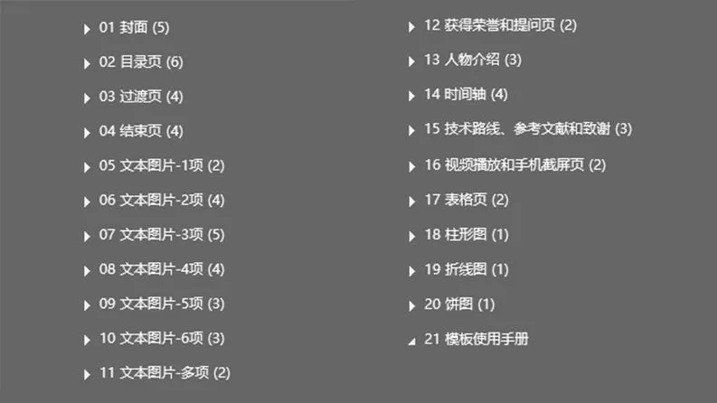 为了增加版式的丰富性,满足大家多样化的需求,我们将模板根据使用场景分成了21个节,模板61页,模板使用手册30页。