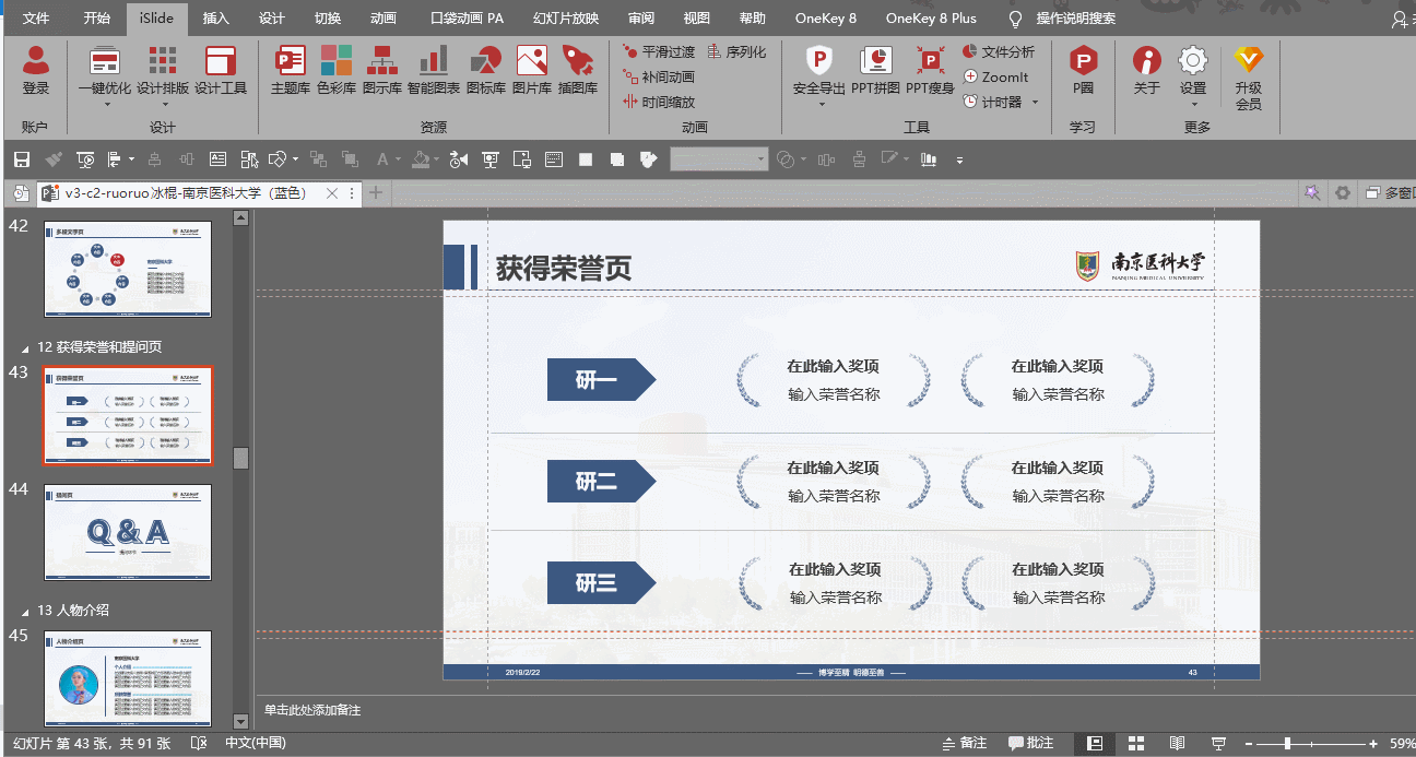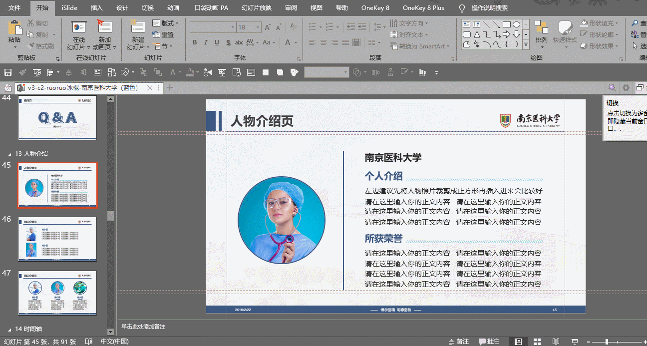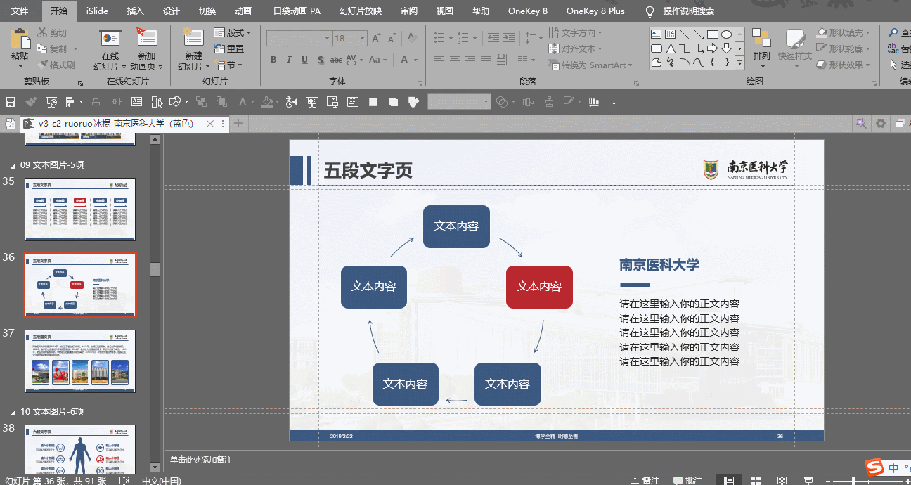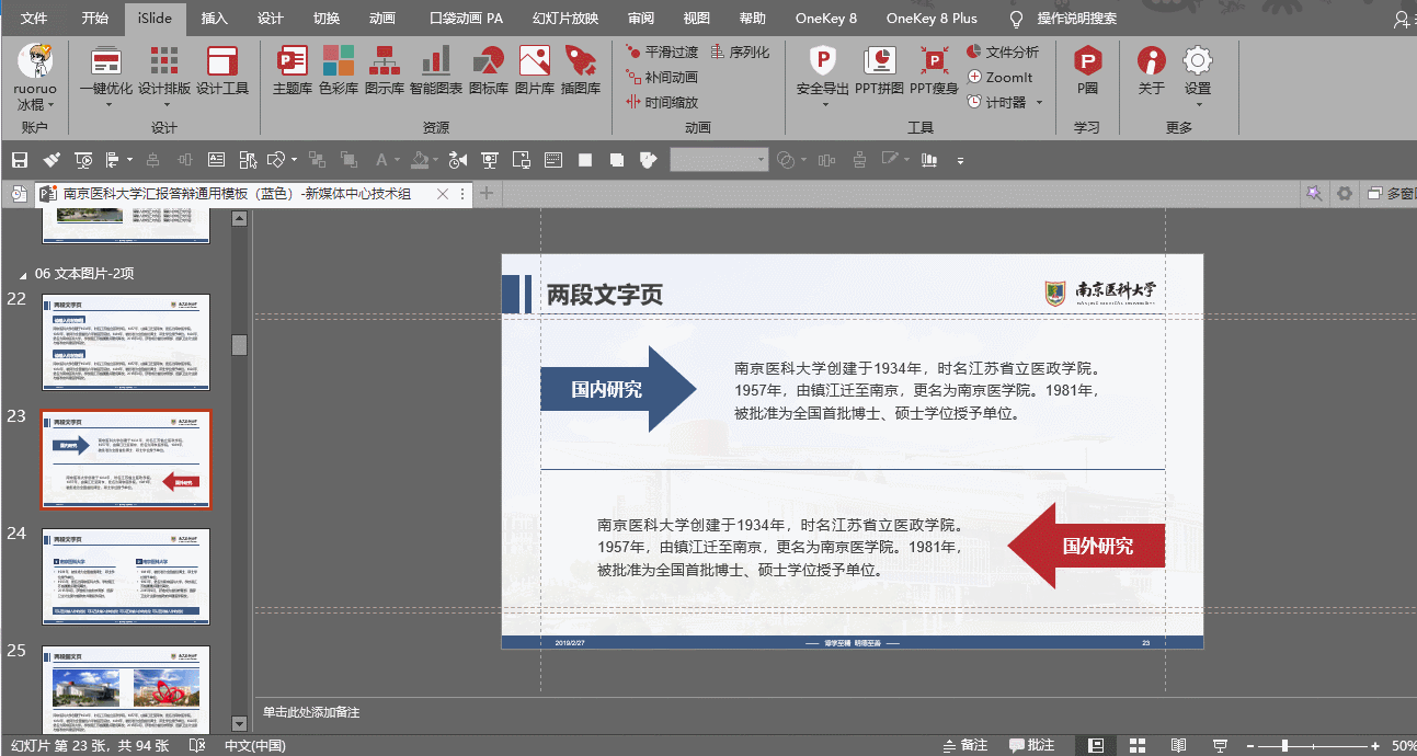 此外,还可以利用模板使用手册附赠的常用图标、常用南医大图片进行页面上的延展,利用一键替换字体进行字体上的延展。