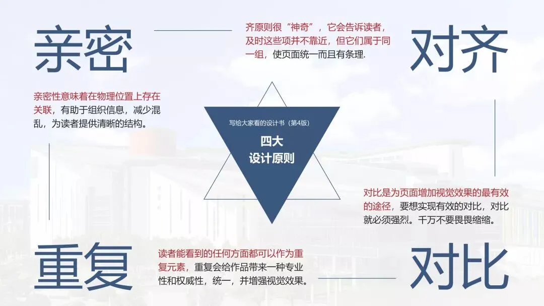 如果你能有意识地用上图展示的四大设计原则指导你的PPT设计,你也可以做出很棒的PPT。这四条设计原则,你几乎可以在所有的专业PPT里看到它们的影子,以模板中的一页为例: