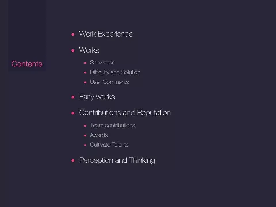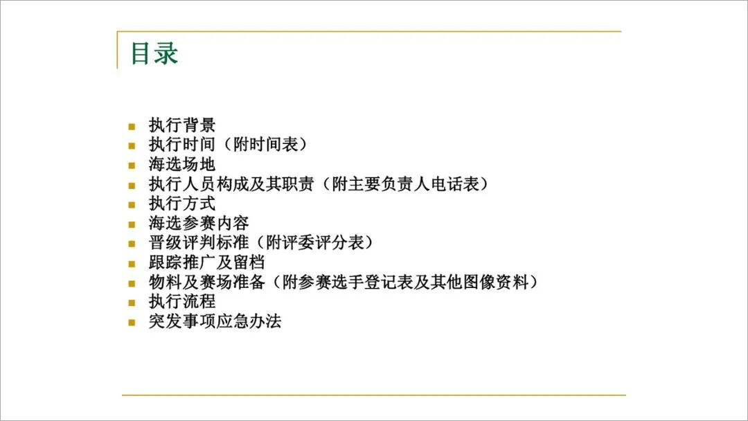 最后,再补充一点我个人的想法,目录页的本质是为了清晰地展示演讲结构,所以,不要拘泥于固定的样式结构。只要能够起到展示结构的作用,都是好创意。