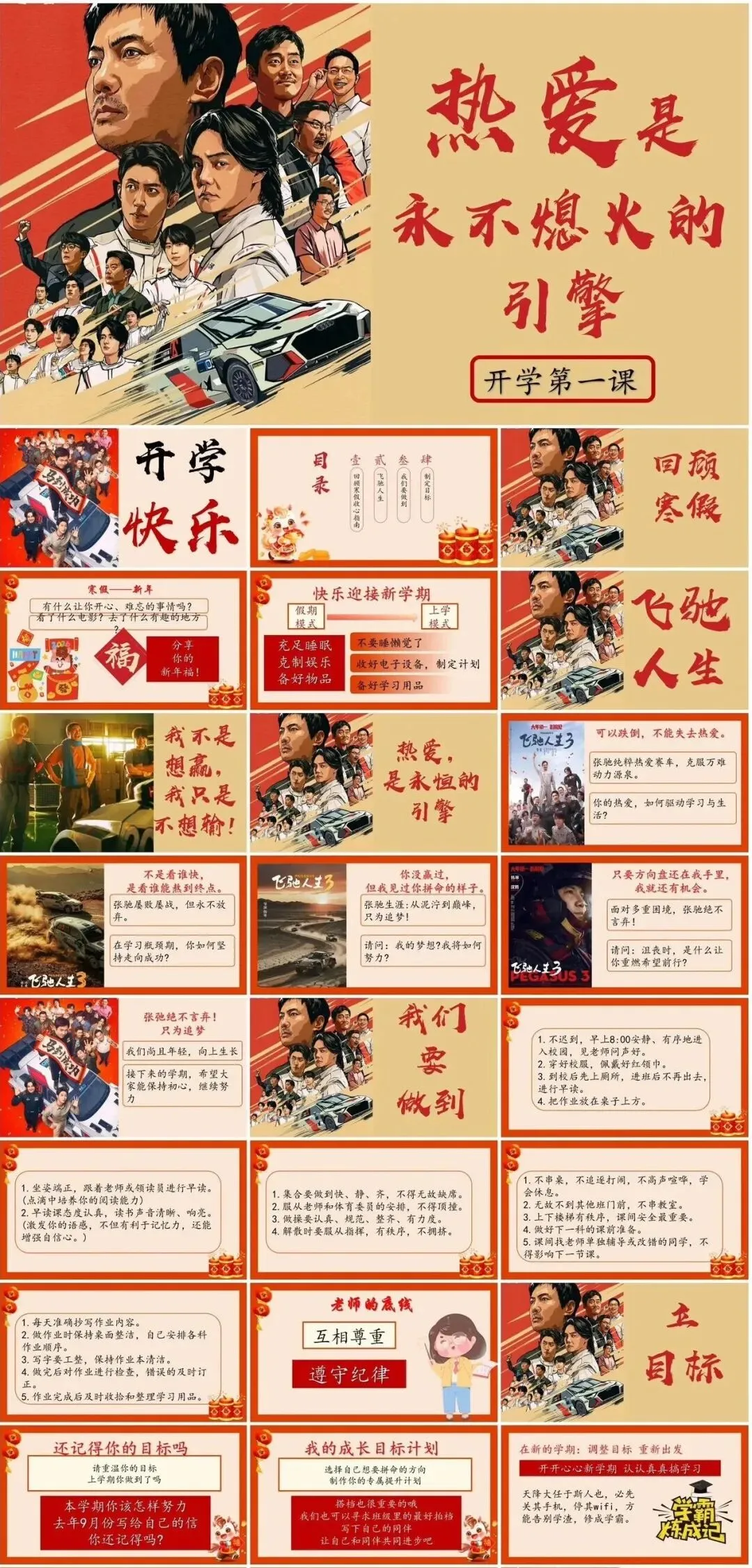 这份以《飞驰人生3》为灵感的PPT模板,将热血追逐、无畏奔赴的故事感融入校园场景,愿陪伴你在知识的赛道上,点燃激情,书写属于自己的飞驰篇章。#开学主题ppt模板#开学第一课班会逐字稿#飞驰人生3开学主题ppt模板