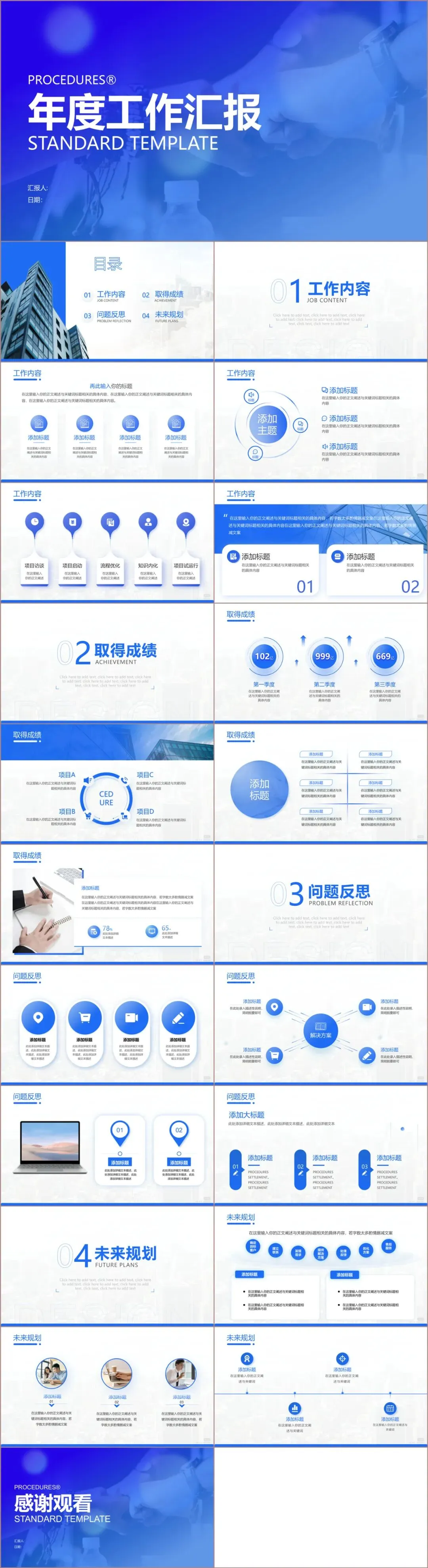 目录页:将汇报拆解为“工作内容、取得成绩、问题反思、未来规划”四个标准模块。